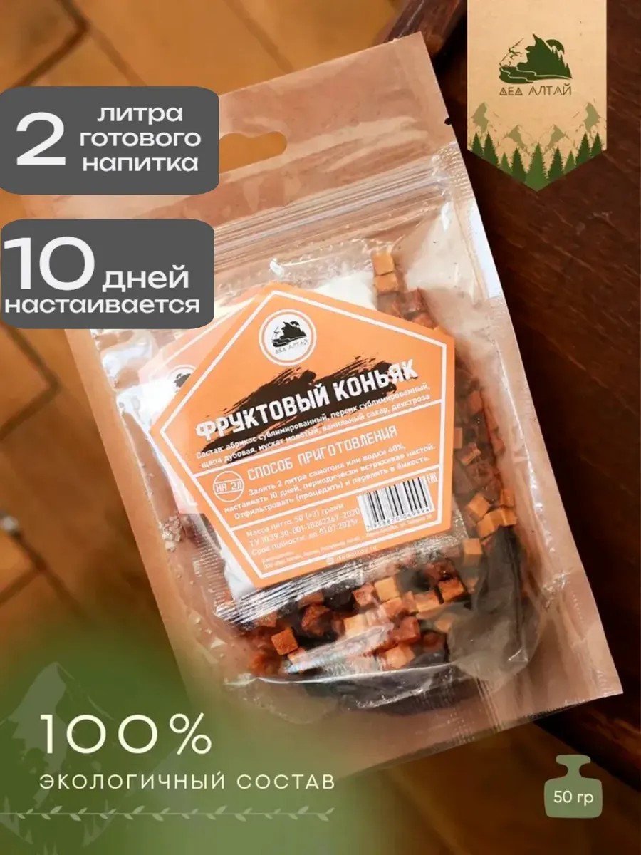 Fruit cognac. Rich, aromatic, and smooth! It has a noble, velvety taste with fruity undertones and a lingering aftertaste! Does the aroma reveal notes of sweet vanilla? Contains the most aromatic freeze-dried fruits: peach and apricot. Also contains oak chips, ground nutmeg, and vanilla sugar. This homemade cognac, made with your own hands, is one of the best drinks to delight guests with! Recipe: Pour 2 liters of moonshine or 40% vodka into the cognac, let it steep for 10 days, shaking occasionally. Filter (strain) and pour into a container.