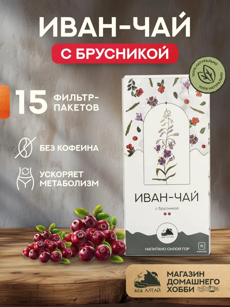 Алтайский травяной чай Иван чай с брусникой Дед Алтай представляет собой уникальное сочетание натуральных ингредиентов, собранных в экологически чистых регионах Алтая. Этот чай создан для тех, кто ценит традиционные и здоровые способы укрепления организма и поддержания хорошего самочувствия. В состав входят Иван чай, сублимированная брусника и лист брусники, что придает напитку неповторимый вкус и аромат. Представленный в форме сухой россыпи, этот чай легко подходит для приготовления в любое время дня. В комплект входит 15 пакетиков, что делает его идеальным выбором для дома, офиса или путешествий. Выбирая Алтайский травяной чай Иван чай с брусникой, вы получаете не только вкусный напиток, но и настоящее удовольствие для здоровья.