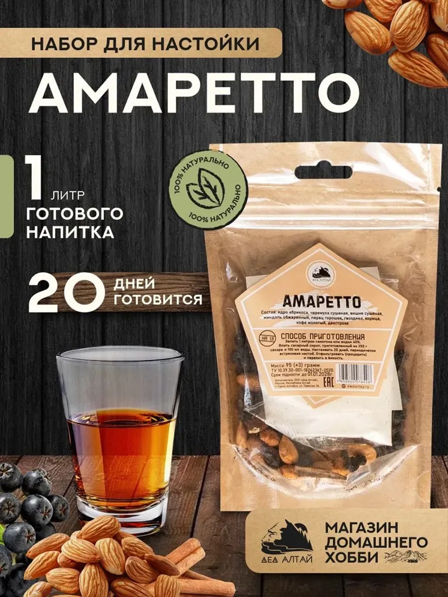 The Amaretto liqueur kit from Ded Altay is your chance to create a true Italian liqueur at home. It contains only natural ingredients, sourced from the ecologically clean Altai Mountains. Apricot kernels, bird cherry, cherry, almonds, pepper, cloves, cinnamon, and coffee—this unique combination will give your drink an inimitable aroma and flavor. Follow the instructions, and you'll have a delicious liqueur that will grace your table and delight you and your guests.