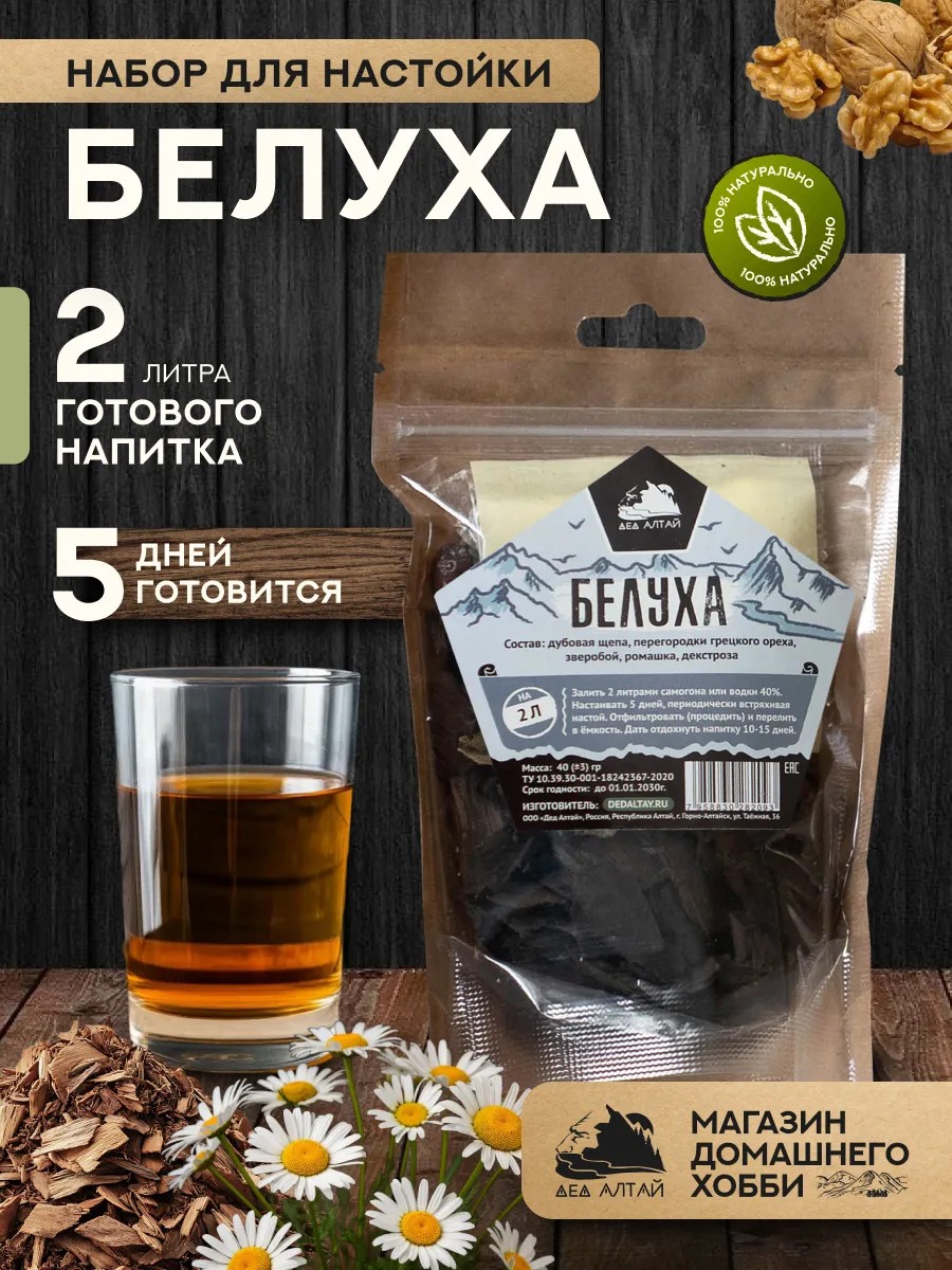 Набор для приготовления настойки Белуха Дед Алтай - это отличный подарок для любителей домашних напитков. В набор входят натуральные травы и специи, собранные на Алтае, а также этикетка для бутылки. С помощью этого набора вы сможете приготовить ароматную и полезную настойку, которая станет отличным дополнением к праздничному столу или просто приятным подарком для близкого человека. Настойка Белуха - это уникальный вкус и аромат, а также забота о здоровье, ведь в ее состав входят только натуральные ингредиенты.