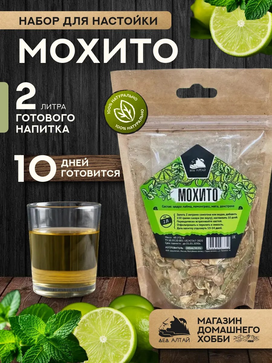 Набор для приготовления настойки Мохито от Дед Алтай — это ваш путь к освежающему и бодрящему напитку прямо из сердца Алтая. В состав набора входят только натуральные ингредиенты: цедра лайма, лемонграсс, мята и декстроза, которые идеально сочетаются для создания настоящей настойки Мохито. С этим набором вы сможете насладиться вкусом лета в любое время года, а натуральность и качество продуктов от Дед Алтай гарантируют неповторимый аромат и вкус.
