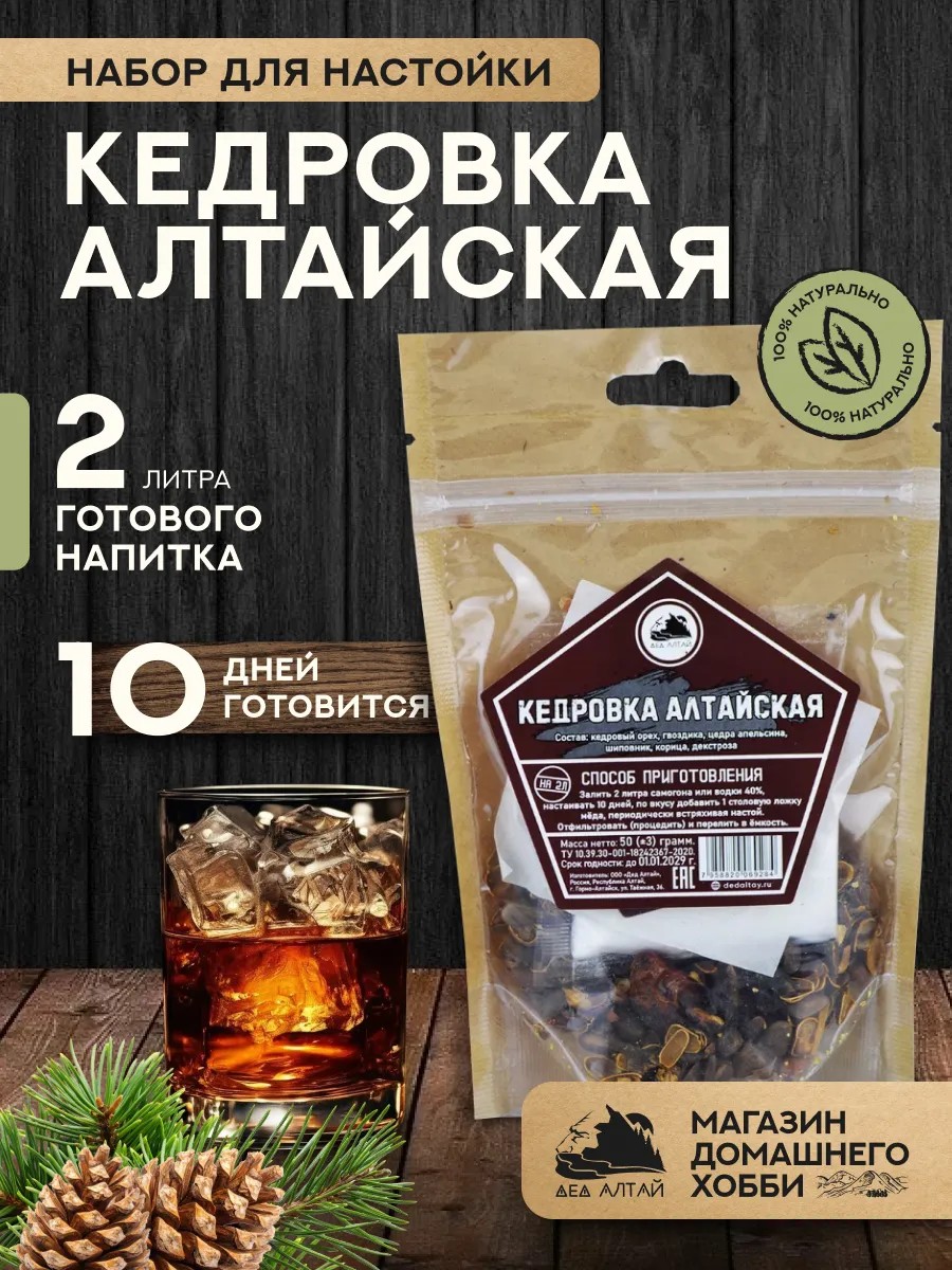 The "Altai Kedrovka" liqueur kit from "Ded Altai" is your chance to create a unique drink with a rich flavor and aroma. The kit contains only natural ingredients harvested in the ecologically clean Altai Mountains: rose hips, cinnamon, dextrose, pine nuts, cloves, and orange zest. This unique mix of spices and herbs will give your moonshine or vodka the inimitable aroma and rich flavor of the Siberian taiga. Treat yourself and your loved ones to an authentic Altai liqueur, made with your own hands.