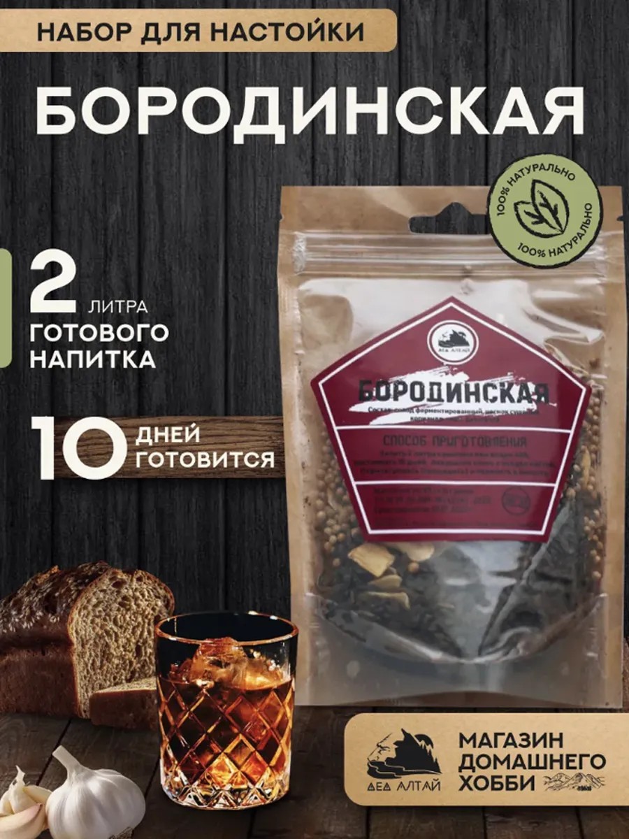 The Borodinskaya liqueur kit from Ded Altai is your chance to create a unique drink with a rich flavor and aroma. The kit contains only natural ingredients harvested in the ecologically clean Altai Mountains: fermented malt, dried garlic, coriander, caraway, and dextrose. This kit will allow you to prepare an authentic Borodinskaya liqueur, which will delight you with its unique flavor and aroma.