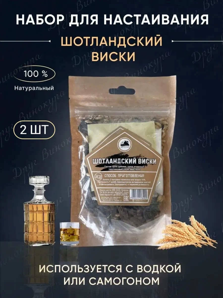 Набор трав и специй Шотландский виски. Есть несколько причин в него влюбиться: мягкий, сбалансированный, округлый вкус с нотами дуба и ванили; приятная солодовая сладость в аромате; красивый золотистый цвет напитка. Настойка легко пьется в чистом виде, так же прекрасна в коктейлях. В комплекте с набором трав и специй находится фирменная наклейка для бутылки с готовым напитком и декстроза. Набор рассчитан на 4 литра алкогольной основы (самогон, водка). Дед Алтай это более 80 наборов для изготовления домашних настоек на водке или самогоне на любой вкус. Все травы собираются на Алтае и фасуются вручную.