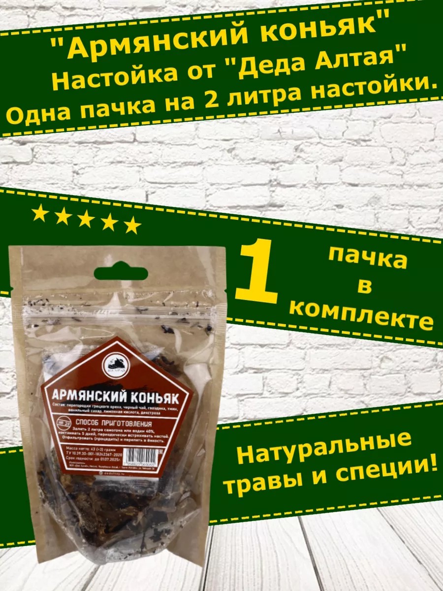 Настойка «Армянский Коньяк» на 2 литра для самогона, водки. Набор трав и специй для настаивания от компании "Дед Алтай".Армянский коньяк имеет свойственный только ему вкус и аромат известный во всем мире. Используя наш набор трав и специй "Армянский коньяк" вы получите настойку с потрясающим вкусовым букетом, совсем бархатным. Вкус напитка раскрывается ореховыми нотками, которые удачно дополнены пряно-ванильными нюансами. Очень мягкое, постепенно раскрывающееся послевкусие с легкой горчинкой, благодаря чему крепость напитка почти не ощущается. В комплекте с набором трав и специй находится фирменная наклейка для бутылки с готовым напитком и декстроза. Набор рассчитан на 2 литра алкогольной основы (самогон, водка). В упаковке 3 набора. Дед Алтай это более 80 наборов для изготовления домашних настоек на самогоне или водке на любой вкус. Все травы собираются на Алтае и фасуются вручную.Наборы трав и специй от компании «Дед Алтай» состоят исключительно из натуральных ингредиентов без искусственных добавок и красителей. Они отлично подходят для настаивания домашнего алкоголя и позволят Вам получить вкусный напиток отменного качества!Состав: перегородки грецкого ореха, черный чай, гвоздика, тмин, ванильный сахар, лимонная кислота, декстроза.Рецепт: залить 2 литрами самогона или водки 40%, настаивать 5 дней, периодически встряхивая настой. Отфильтровать (процедить) и перелить в ёмкость.Масса нетто: 43 грамма