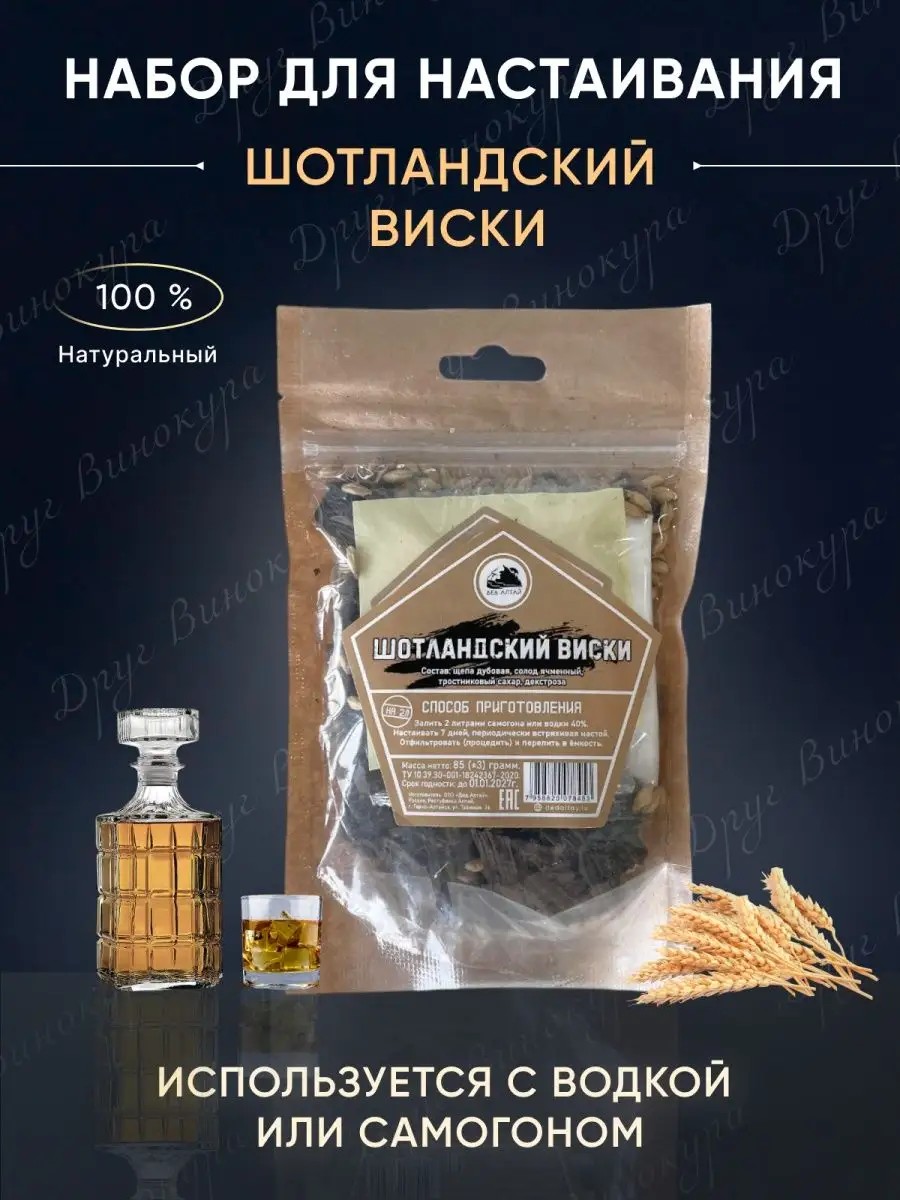 Herbs and spices set for Scotch whiskey. There are several reasons to fall in love with it: a soft, balanced, rounded taste with notes of oak and vanilla; a pleasant malty sweetness in the aroma; and a beautiful golden color. The tincture is easy to drink neat and also wonderful in cocktails. The herb and spice set comes with a branded bottle sticker and dextrose. The set is designed for 2 liters of alcoholic base (moonshine, vodka). Ded Altai offers over 80 kits for making homemade tinctures with vodka or moonshine to suit every taste. All herbs are collected in the Altai Mountains and packaged by hand.