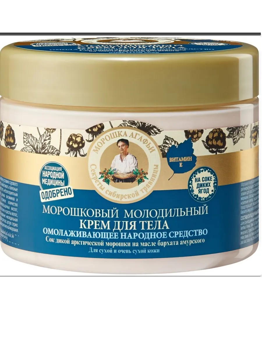 Рецепты Бабушки Агафьи Крем для тела Морошковый Молодильный, 300 мл морошку в народе величественно называют молодильная ягода за её мощные регенерирующие и тонизирующие свойства. Ее богатый витаминами сок использовали для восстановления красоты и молодости кожи. Сок дикой арктической морошки, обогащенный антиоксидантами и микроэлементами, стимулирует обновление клеток, придавая коже свежесть и упругость. Масло даурской розы предотвращает увядание кожи и обладает подтягивающим действием. Масло бархата амурского смягчает кожу и придает ей природное сияние.