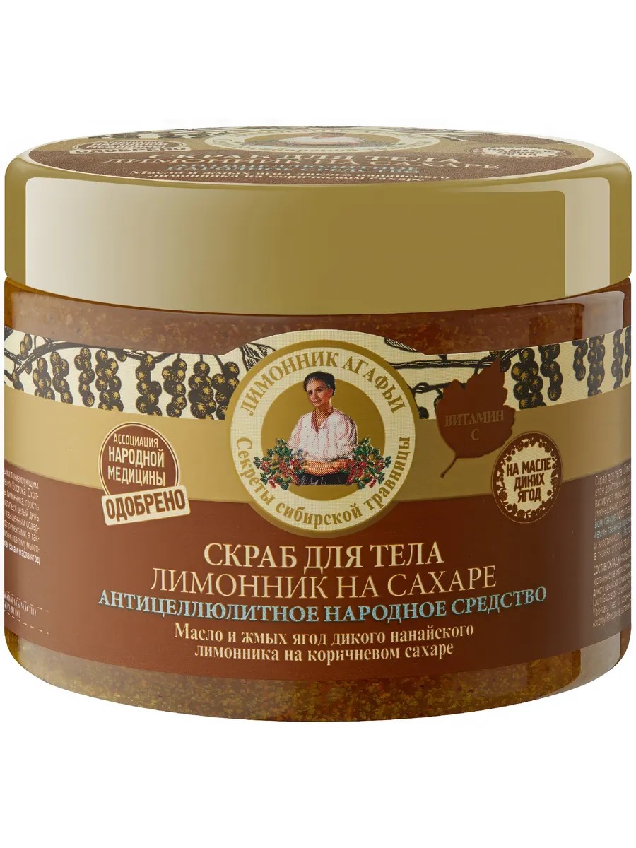 Скраб Рецепты бабушки Агафьи для тела, антицеллюлитный, лимонник на сахаре, 300 мл. Скраб для тела Лимонник на сахаре создан по старинному народному рецепту и является действенным средством в борьбе с целлюлитом. Его природные компоненты активизируют микроциркуляцию, бережно обновляют и выравнивают кожу, способствуют уменьшению жировых отложений. Жмых ягод дикого нанайского лимонника на коричневом сахаре эффективно очищает, отшелушивает и смягчает кожу. Органическое масло семян таёжной брусники увлажняет и насыщает кожу витаминами, повышает упругость и эластичность. Масло ягод дикого нанайского лимонника стимулирует кровообращение в тканях, способствуя сжиганию жировых клеток и уменьшению целлюлита. Состав:Aqua with infusions of Organic Vaccinium Macrocarpon Seed Oil (органическое масло семян северной клюквы), Schizandra Chinensis Fruit Extract (масляный экстракт ягод дикого нанайского лимонника) ; Lauryl Glucoside, Carbomer, Chinensis Fruit Cake (жмых ягод дикого нанайского лимонника), Organic Vaccinium Vitis-Idaea Seed Oil (органическое масло семян таёжной брусники), Pinus Sibirica Shell Powder (скорлупа кедрового ореха), Sucrose (коричневый сахар), Sodium Ascorbyl Phosphate (витамин C), Potassium Hydroxide, Benzyl Alcohol, Benzoic Acid, Sorbic Acid, Parfum. Небольшое количество скраба нанесите на влажную кожу тела активными массирующими движениями, смойте теплой водой.