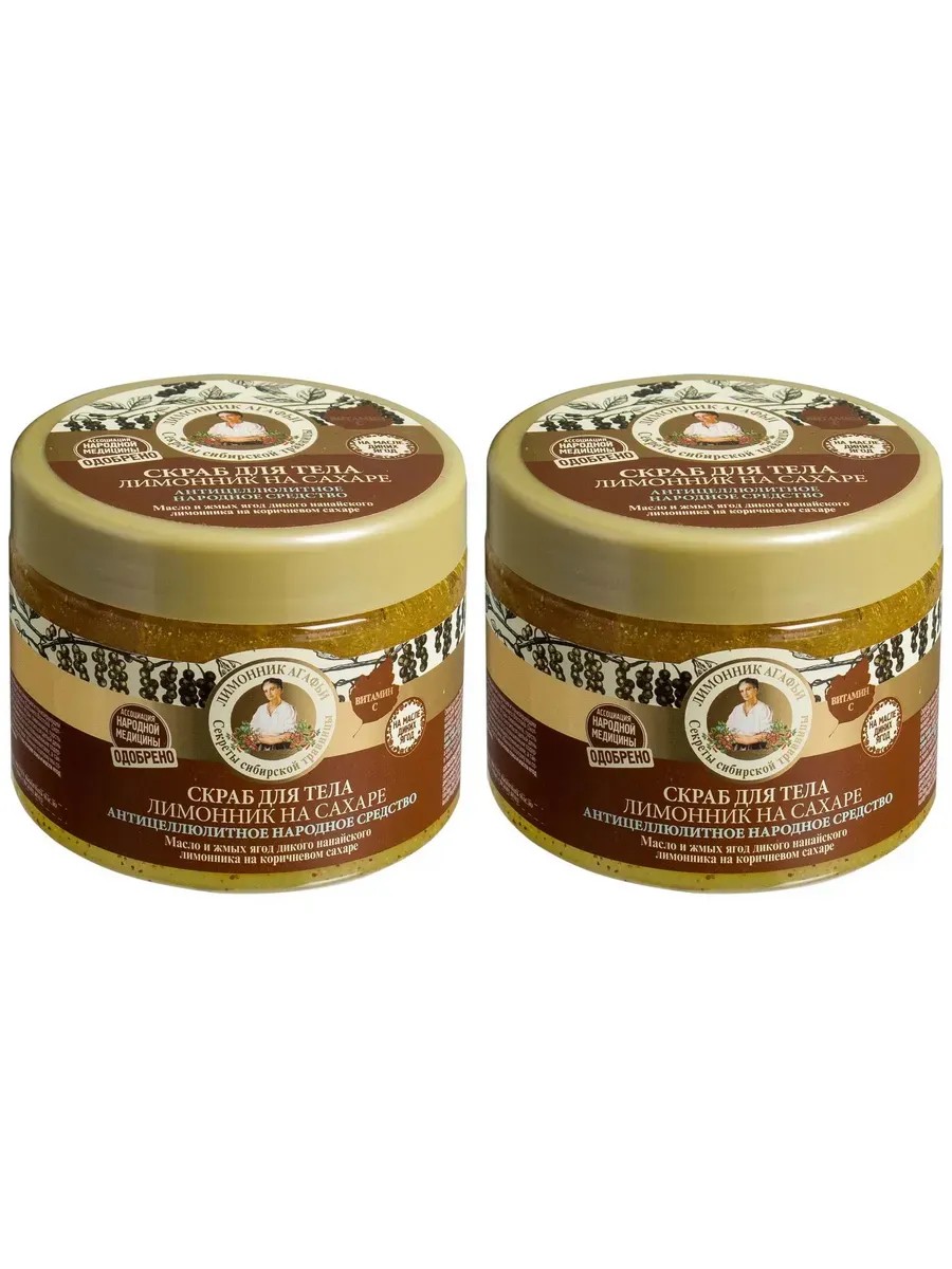 Скраб для тела Рецепты Бабушки Агафьи Лимонник на сахаре, 300 мл. РБА скраб для тела лимонник на сахаре 300 мл. Жмых ягод дикого нанайского лимонника на коричневом сахаре эффективно очищает, отшелушивает и смягчает кожу. Органическое масло семян таёжной брусники увлажняет и насыщает кожу витаминами, повышает упругость и эластичность. Масло ягод дикого нанайского лимонника стимулирует кровообращение в тканях, способствуя сжиганию жировых клеток и уменьшению целлюлита. В комплекте 2 штуки.