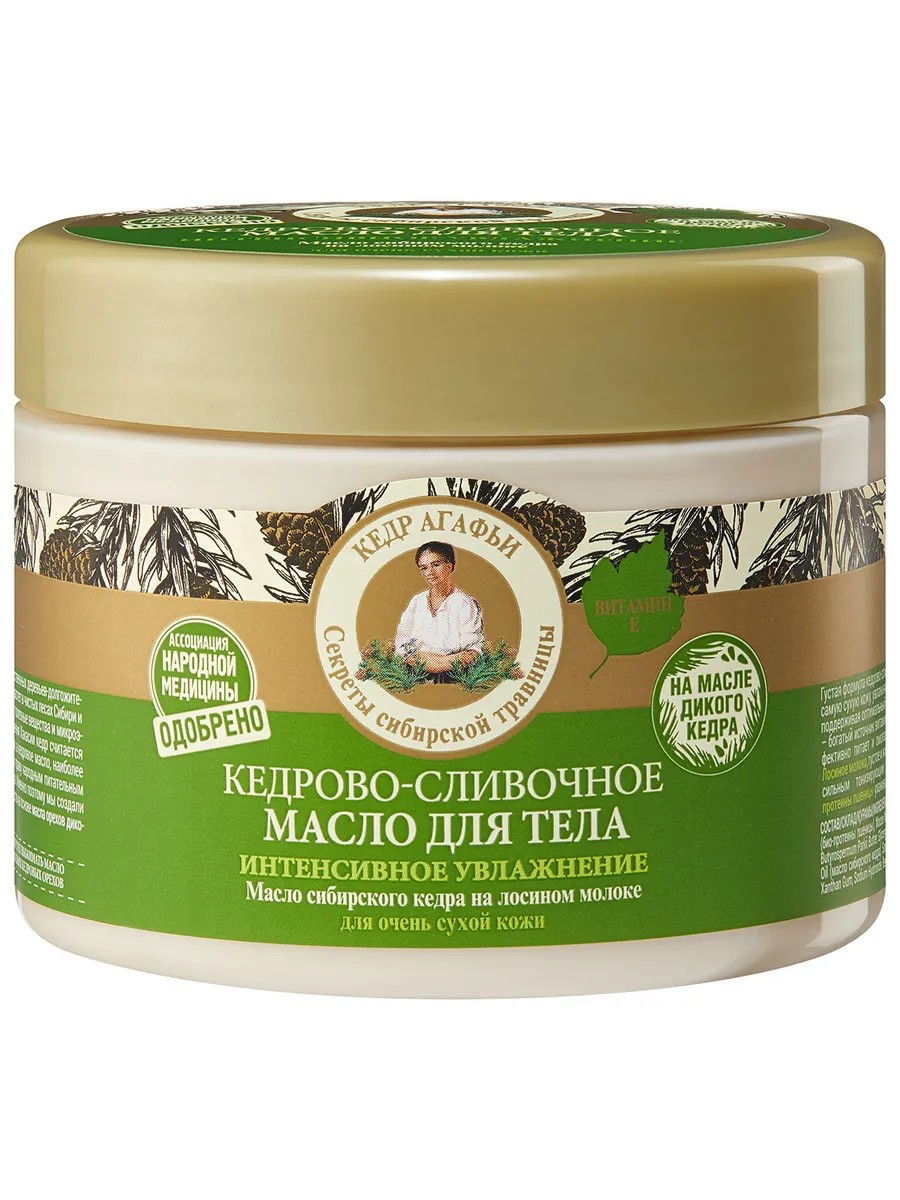 Рецепты бабушки Агафьи Масло для тела кедрово-сливочное Интенсивное увлажнение 300мл. Крем для тела увлажняющий и питательный бабушка Агафья с насыщенной густой текстурой идеально подходит для ухода за сухой кожей.