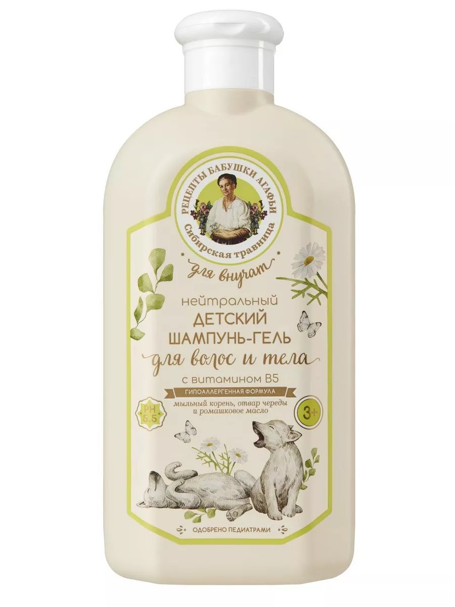 Шампунь-гель для волос и тела детский Рецепты Бабушки Агафьи Для внучат Нейтральный с витамином В5, 500 мл. Нейтральный шампунь-гель идеально подходит для купания маленьких непосед от макушки до пяточек. Его сбалансированная формула создана с учётом особенностей нежной кожи и детских волос.