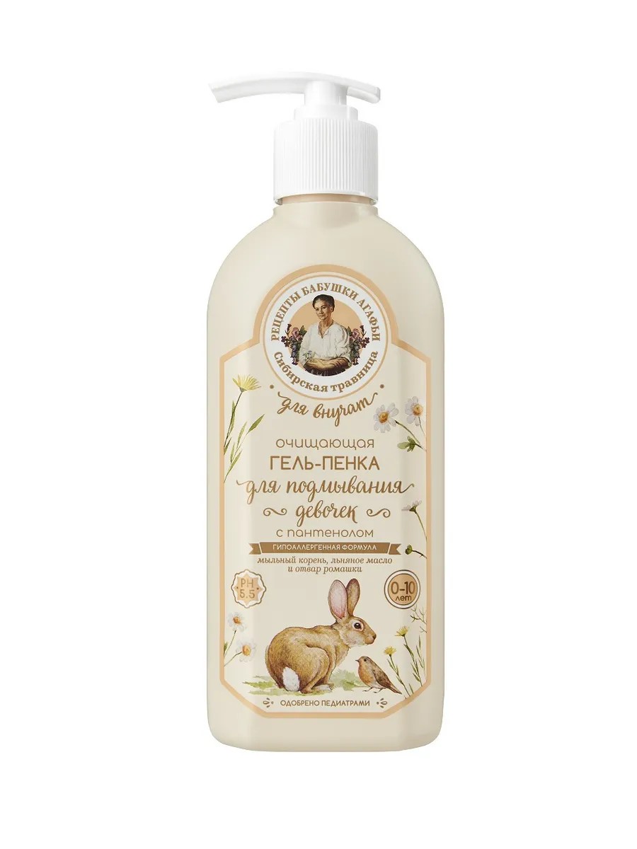 | Полное наименование товара | Очищающая гель-пенка с пантенолом для подмывания девочек "0-10 лет" Для Внучат, Рецепты бабушки Агафьи, 350 мл |