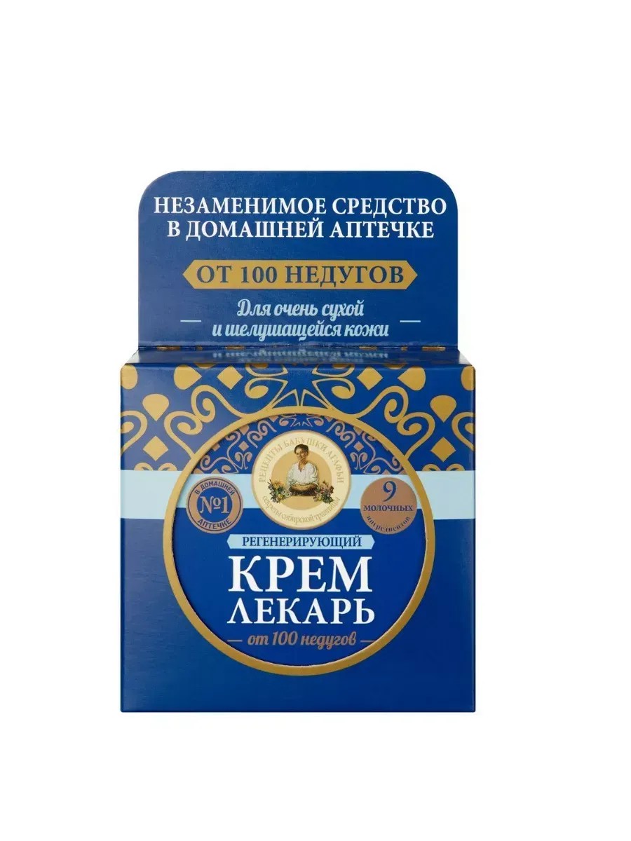 Рецепты Бабушки Агафьи, Крем-лекарь "Регенерирующий", 100 мл. Крем-лекарь создан по традиционному рецепту сибирской травницы Агафьи. Его живительная сила заключается в уникальном составе, который состоит из 9 молочных компонентов, специально подобранных для сохранения молодости и красоты кожи на долгие годы. Эти компоненты глубоко проникают в кожу и ускоряют процессы регенерации клеток, оказывая стойкий омолаживающий эффект. Молочная сыворотка содержит более 200 биологически активных веществ, антиоксиданты, бета-каротин, белки и аминокислоты. Она эффективно обновляет и увлажняет кожу. Сливки богаты витаминами А, В, С и микроэлементами успокаивают и освежают кожу. Молочные протеины активизируют обновление клеток, выравнивают текстуру кожу. Козье молоко замедляет процесс старения, сокращает морщины. Лосиное молоко в 4 раза питательнее коровьего, способствует восстановлению и смягчению кожи. Оленье молоко глубоко питает и защищает кожу от вредных воздействий окружающей среды. Кефирная закваска повышает упругость и эластичность кожи. Кумыс тонизирует и заряжает кожу энергией. Крем можно применять ежедневно, для омоложения, интенсивного питания, и увлажнения, а также для защиты кожи лица и тела в любое время года.