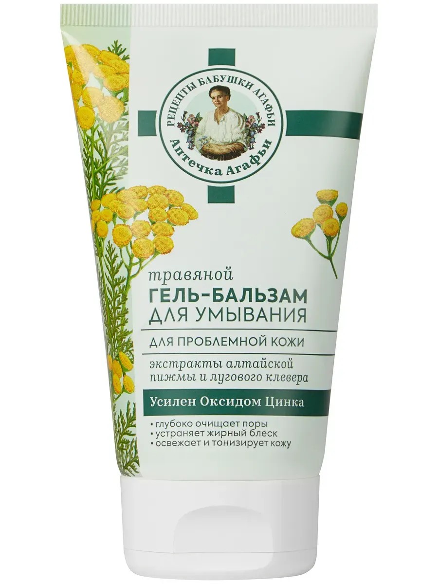 Gel-balm "Grandma Agafia's First Aid Kit" for problem skin, moisturizing, 150 ml. Herbal gel-balm for washing. Combining modern cosmetic developments and traditional recipes of a Siberian herbalist, we have created the healing Agafia's First Aid Kit series for you. This herbal gel-balm for washing with silver water is created according to the ancient recipes of Siberian herbalist Agafia Tikhonovna Ermakova. It effectively yet gently cleanses the skin's surface of impurities, helps combat blackheads, perfectly refreshes the skin, and restores its natural radiance and smoothness. ALTAI TANSY EXTRACT has a toning and refreshing effect. MEADOW CLOVER EXTRACT helps fight acne and provides long-lasting hydration. A DECOCTION OF SIBERIAN MEADOWSWEET AND IVAN-TEA contains flavonoids that improve metabolic processes in skin cells, protect against stress and dehydration. ZINC OXIDE dries the skin, removes toxins, disinfects, and relieves irritation. Ingredients: Aqua with infusions of Ag+ (silver ions), Tanacetum Vulgare Flower Extract (Altai tansy extract), Trifolium Pratense Extract (red clover extract), Spiraea Ulmaria Extract (decoction of Siberian meadowsweet), Epilobium Angustifolium Extract (Ivan-tea extract); Sodium Laureth Sulfate, Hydrogenated Starch Hydrolysate, Glycerin, Cocamidopropyl Betaine, Lauryl Glucoside, Zinc PCA (Zinc Oxide), Niacinamide (Vitamin PP), Glyceryl Oleate, Allantoin (Allantoin), Citric Acid, Benzyl Alcohol, Sodium Benzoate, Potassium Sorbate, Styrene/Acrylates Copolymer, Parfum, CI 19140, CI 42090. Apply a small amount of gel-balm to damp skin of the face, massage gently, paying special attention to the T-zone, then rinse with plenty of water. We recommend using twice a day, morning and evening.