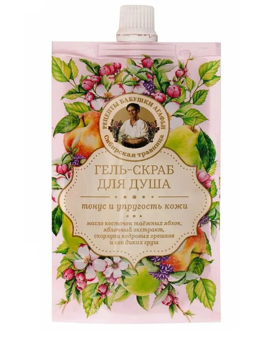 Skin Tone and Firmness Shower Gel Scrub. This gel scrub renews and cleanses the skin, moisturizes and tones it, leaving it soft and smooth. It contains apple extract and taiga apple seed oil. Apple is a perfect ingredient in this scrub – malic acid tones well without irritating delicate skin, evens out its tone, and moisturizes. Wild pear juice also promotes rejuvenation. For optimal and gentle exfoliation, crushed pine nut shells are added to the gel scrub.