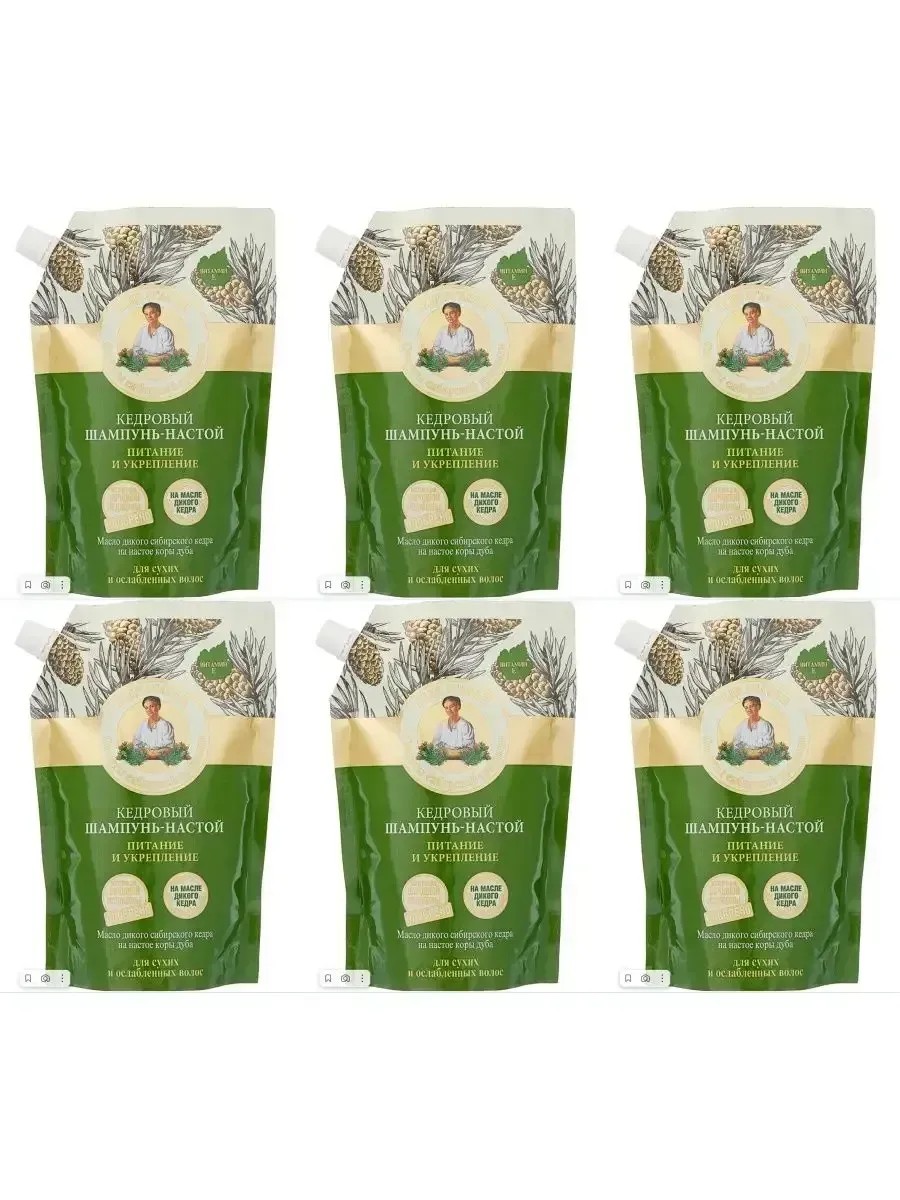 RBA Cedar Infusion Nourishing and Strengthening Hair Shampoo, 500 ml. Set of 6. Soap root gently cleanses the hair and scalp without disturbing the natural balance. Oak bark infusion and hempseed extract strengthen weakened roots, giving hair strength and natural volume. Siberian cedar oil is rich in polyunsaturated fatty acids and vitamins that intensively nourish and thicken the hair structure. Organic Siberian flax oil restores damaged hair, increasing its strength and elasticity.