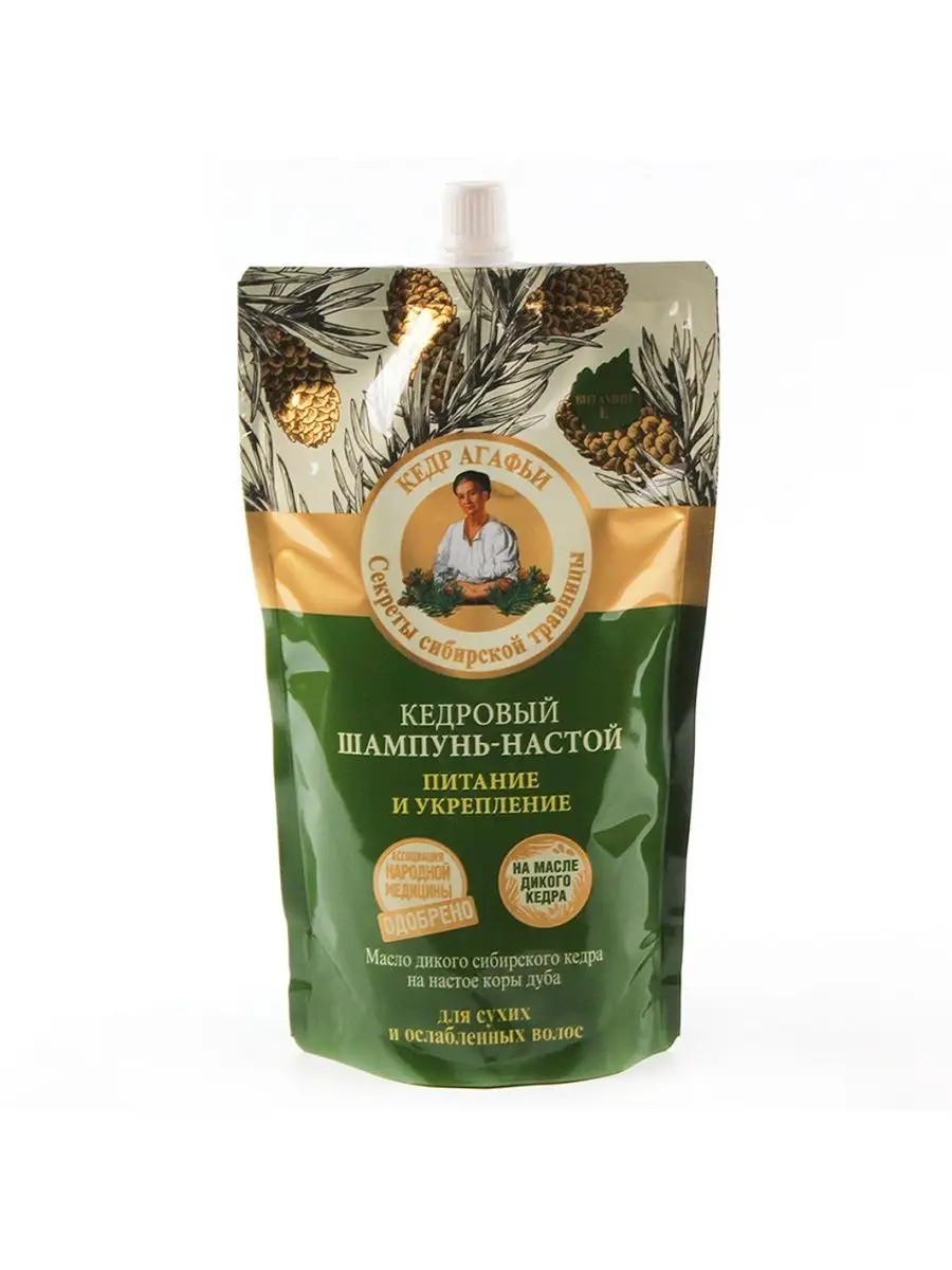 Рецепты бабушки Агафьи Шампунь для волос женский Кедровый Питание и укрепление 500мл дой-пак. Шампунь для волос женский для питания и укрепления волос. Кедровый шампунь-настой на основе заваренных трав, коры дуба и масла дикого кедра насыщает волосы необходимыми микроэлементами, делая их сильными и крепкими. Мыльный корень бережно очищает волосы и кожу головы, не нарушая естественного баланса. Настой коры дуба и экстракт семисильника укрепляют ослабленные корни, придавая волосам силу и естественный объём. Масло сибирского кедра богато полиненасыщенными жирными кислотами и витаминами, которые интенсивно питают и уплотняют структуру волос. Органическое масло сибирского льна восстанавливает поврежденные волосы, повышает их прочность и эластичность. Благодаря своей мягкой формуле, он подходит для всех типов волос и может использоваться ежедневно.