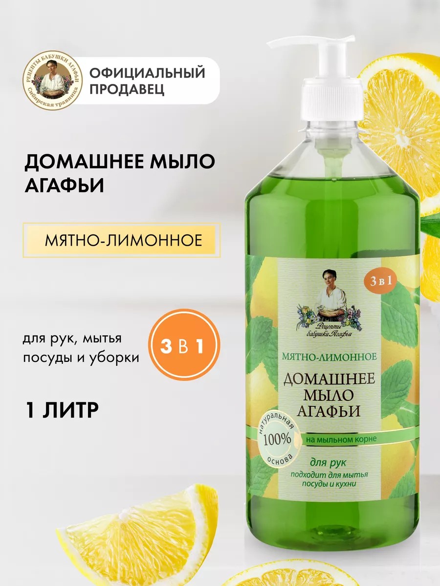 Домашнее мыло Агафьи 3 в 1 «Мятно-лимонное» 1 литр создано с учетом трех особенностей: эффективность, чистота и безопасность. Мыльный корень — натуральная, хорошо пенящаяся основа, безопасная и мягче щелочной, применяемой в обычном мыле. Питательные эфирные масла мяты и лимона бережно ухаживают за кожей рук, позволяют использовать очищающее средство не только для ежедневного мытья посуды, фруктов и овощей, уборки рабочих кухонных поверхностей, но и для ухода за кожей рук.