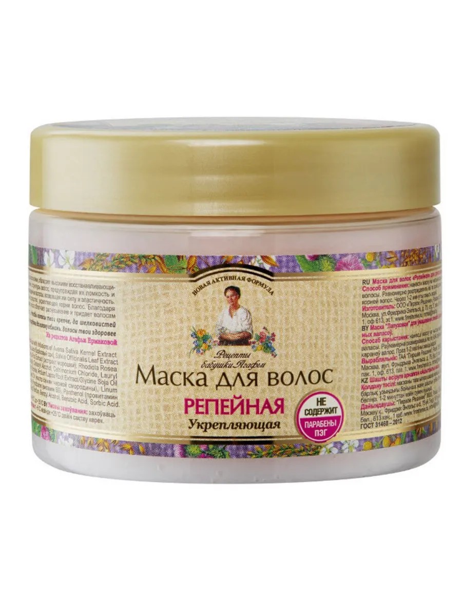 Grandma Agafia's Recipes: Strengthening Burdock Mask for Weakened Hair, 300 ml. Burdock oil is essential for hair care; it has powerful restorative properties and helps strengthen the hair structure, preventing breakage and split ends. Oat bran nourishes damaged hair, restoring its strength and elasticity. Birch sap is a well-known folk remedy for strengthening hair roots. Thanks to the content of cold-pressed oils, the mask makes combing easier and gives hair a natural shine and silkiness.
