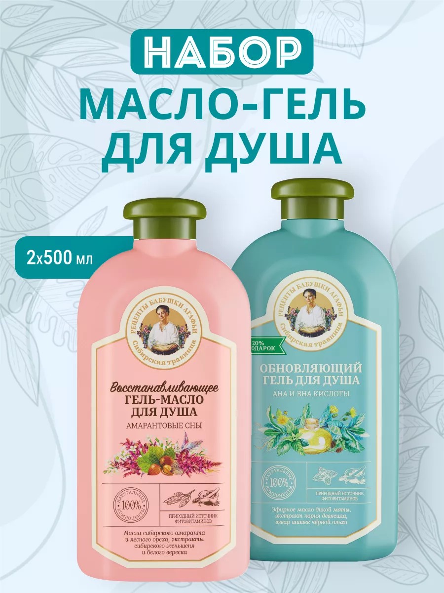 | Комплектация | Бабушка Агафья Гель для душа Обновляющий 500мл; Бабушка Агафья Гель масло для душа Восстанавливающее 500мл |