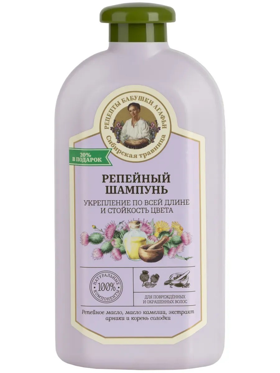 Шампунь Рецепты бабушки Агафьи Сибирская травница для поврежденных и окрашенных волос, укрепление по всей длине и стойкость цвета, репейный, 500 мл. Тому, кто хочет былую красоту своих локонов восстановить, следует пользоваться укрепляющем шампунем он специально создан для помощи поврежденным и окрашенным волосам. Репейное масло препятствует вымыванию пигмента из окрашенных локонов и укреплению их структуры способствует. Если волосы повреждены, то без него точно не обойтись витамины и жирные кислоты репейного масла помогут коже головы и восстановят ослабленные корни волос. Масло камелии вернёт им гладкость и блеск, экстракт арники оздоровит и защитит, а корень солодки очистит и ускорит рост. Шампуню репейному удастся вернуть силу и блеск поврежденным волосам, а окрашенным помочь выглядеть здоровыми, гладкими. Состав:Aqua with infusions of Arnica Montana Flower Extract (экстракт цветков арники), Glycyrrhiza Glabra Root Extract (экстракт корня солодки) ; Arctium Lappa Seed Oil (масло репейное), Camellia Oleifera Seed Oil (масло камелии), Sodium Laureth Sulfate, Cocamidopropyl Betaine, Coco-Glucoside, Guar Hydroxypropyltrimonium Chloride, Benzyl Alcohol, Sodium Benzoate, Potassium Sorbate, Sodium Chloride, Citric Acid, Parfum, CI 28440, CI 14720. нанесите шампунь на влажные волосы, массирующими движениями взбейте в пену и смойте тёплой водой. При необходимости повторите процедуру.
