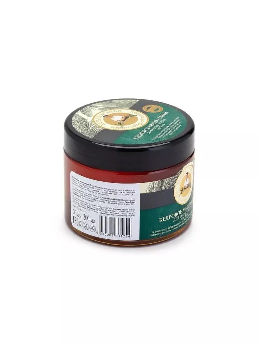 Мыло Рецепты бабушки Агафьи "Банька", для волос и тела, кедровое, 300 мл. Кедровое мыло, насыщенное полезными свойствами трав и масел, комплексно заботится о сохранении молодости волос и тела. Масло сибирского кедра - источник витаминов и микроэлементов, активно восстанавливает поврежденную структуру волос, защищает их от УФ - лучей. Шикша байкальская содержит флавоноиды, способствует питанию кожи головы и укреплению волосяных луковиц. Сосновая живица, благодаря высокому содержанию эфирных масел, укрепляет защитные свойства кожи. Ягоды красного можжевельника богаты органическими кислотами, питают и увлажняют. Органическое масло арники содержит дубильные вещества и витамин C, предотвращает появление перхоти и выпадение волос. Мыльный корень - натуральный моющий компонент. Объем: 300; Вес товара, г: 300;