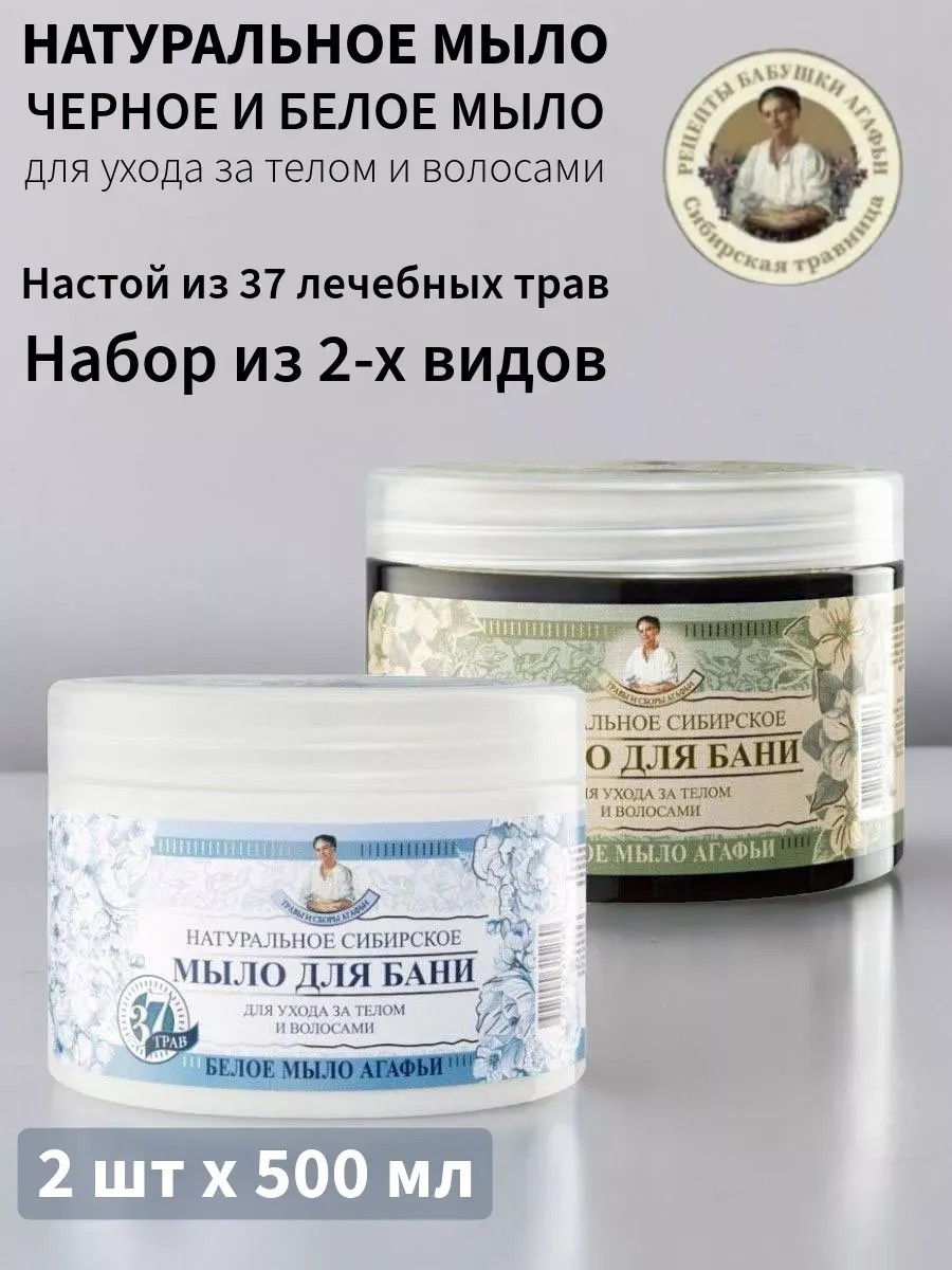 Мыло для бани набор из 2-х видов для волос и тела густое 2 шт. "Бабушка Агафья" - это натуральное и универсальное средство для бережного ухода за кожей и волосами. Вдохновленные традициями жителей Сибири, мы собрали 37 самых целебных трав и создали формулу идеального ухода за всем телом. Это густое мыло содержит только натуральные компоненты, такие как органическое масло кедра, пихты, облепихи и можжевельника, амаранта, шиповника, репейника, льна и настои сибирских трав. Благодаря высокому содержанию питательных витаминов и полезных веществ, оно оказывает оздоравливающее действие на кожу головы и тела, улучшает микроциркуляцию крови, активизирует рост волос, снимает зуд и воспаление. Также в составе присутствуют деготь и березовая чага, что придает мылу черный цвет. Это мыло можно использовать как шампунь для волос, так и гель для душа. Оно идеально подходит для использования в русской бане и сауне. Большой объем 500 мл делает его отличным дополнением косметическим принадлежностям для бани для всей семьи. Ароматное мыло имеет нежный травяной аромат с хвойными пихтовыми и кедровыми нотами, создавая приятную атмосферу спа-терапии. Просто нанесите его на влажные волосы или кожу, помассируйте и смойте теплой водой. Банное мыло "Бабушка Агафья" подходит для мужской, женской и детской кожи, идеально сочетая в себе естественность и эффективность.