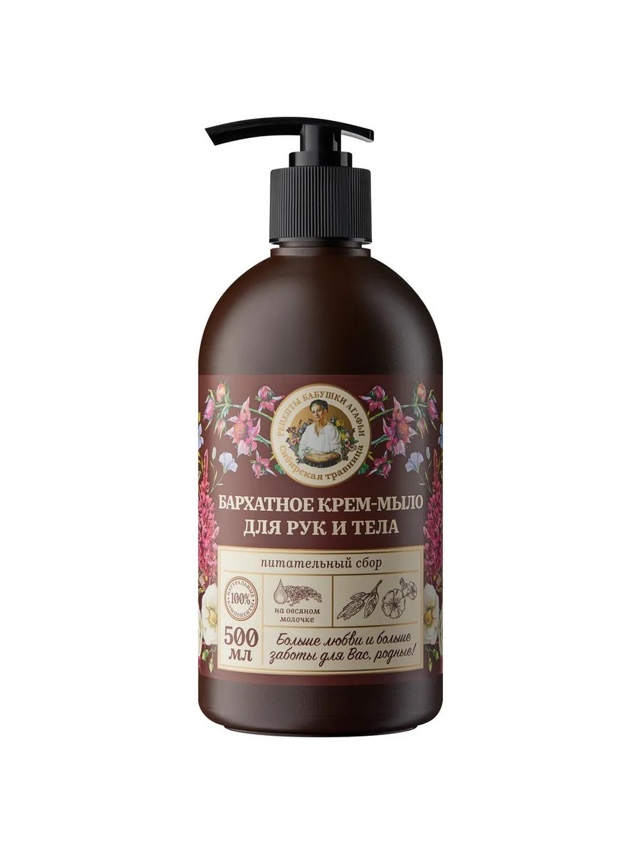 Бархатное крем-мыло для рук и тела Питательный сбор на овсяном молочке Рецепты бабушки Агафьи Сибирская травница 500 мл