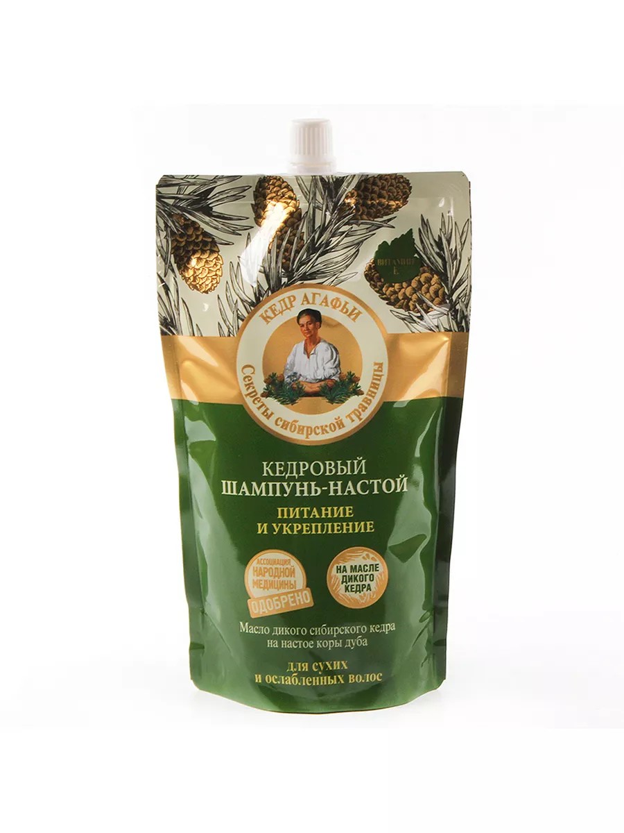 Рецепты бабушки Агафьи Шампунь для волос Кедровый Питание и укрепление 500мл дой-пак. Кедровый шампунь-настой на основе заваренных трав, коры дуба и масла дикого кедра насыщает волосы необходимыми микроэлементами, делая их сильными и крепкими. Мыльный корень бережно очищает волосы и кожу головы, не нарушая естественного баланса. Настой коры дуба и экстракт семисильника укрепляют ослабленные корни, придавая волосам силу и естественный объём. Масло сибирского кедра богато полиненасыщенными жирными кислотами и витаминами, которые интенсивно питают и уплотняют структуру волос. Органическое масло сибирского льна восстанавливает поврежденные волосы, повышает их прочность и эластичность.
