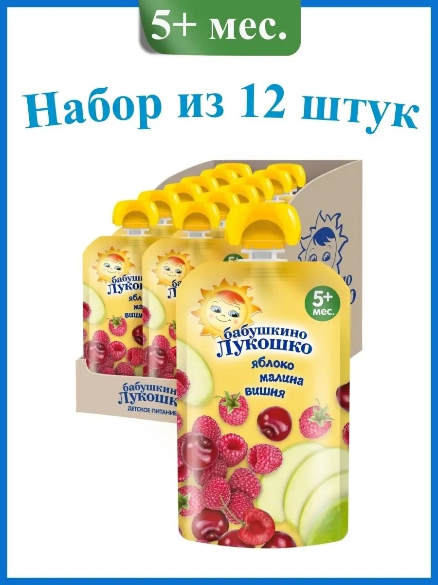Baby food fruit puree "Babushkino Lukoshko" Apple-Pear-Peach for children aged 5 months and older. Apple is a source of fruit acids, vitamin C, iron, and pectin. The combination of iron and vitamin C promotes optimal iron absorption in the intestines, which helps prevent anemia. Pectin and fruit acids gently stimulate gastrointestinal function. Raspberries contain fiber, carbohydrates, glucose, fructose, and tannins. Raspberries have anti-inflammatory, antioxidant, and restorative properties, improve appetite, and strengthen blood vessel walls and the heart muscle. Cherries are rich in vitamins B1, B6, PP, and C; combined with iron, copper, and magnesium, they help increase hemoglobin levels. This tasty and healthy puree in a flexible packaging is convenient to take with you on the road, on a walk, or when visiting. It is recommended to start with 0.5 teaspoon of the puree twice a day, gradually increasing to 100 g per day. The product is ready to eat.