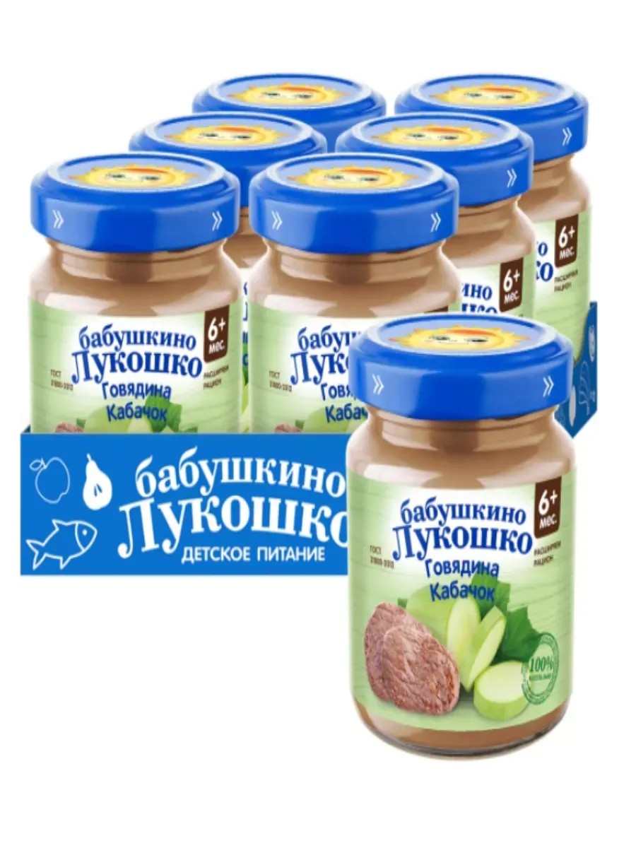 Пюре говядина и Кабачок с 6 месяцев 100 г 6 шт. Говядина - источник незаменимого для ребенка животного белка, витаминов А, С, В6, В12, В1, В2, РР и микроэлементов таких как натрий, калий, кальций, магний, фосфор, железо, медь и цинк. Растительное масло обогащает пюре витамином Е. Говяжье мясо помогает успешно справляться с усталостью, так же оно полезно при железодефицитной анемии. Витамин С, содержащийся в кабачках, помогает усвоению железа и белка говядины. Овсяные хлопья обогащают пюре углеводами и витаминами группы В.