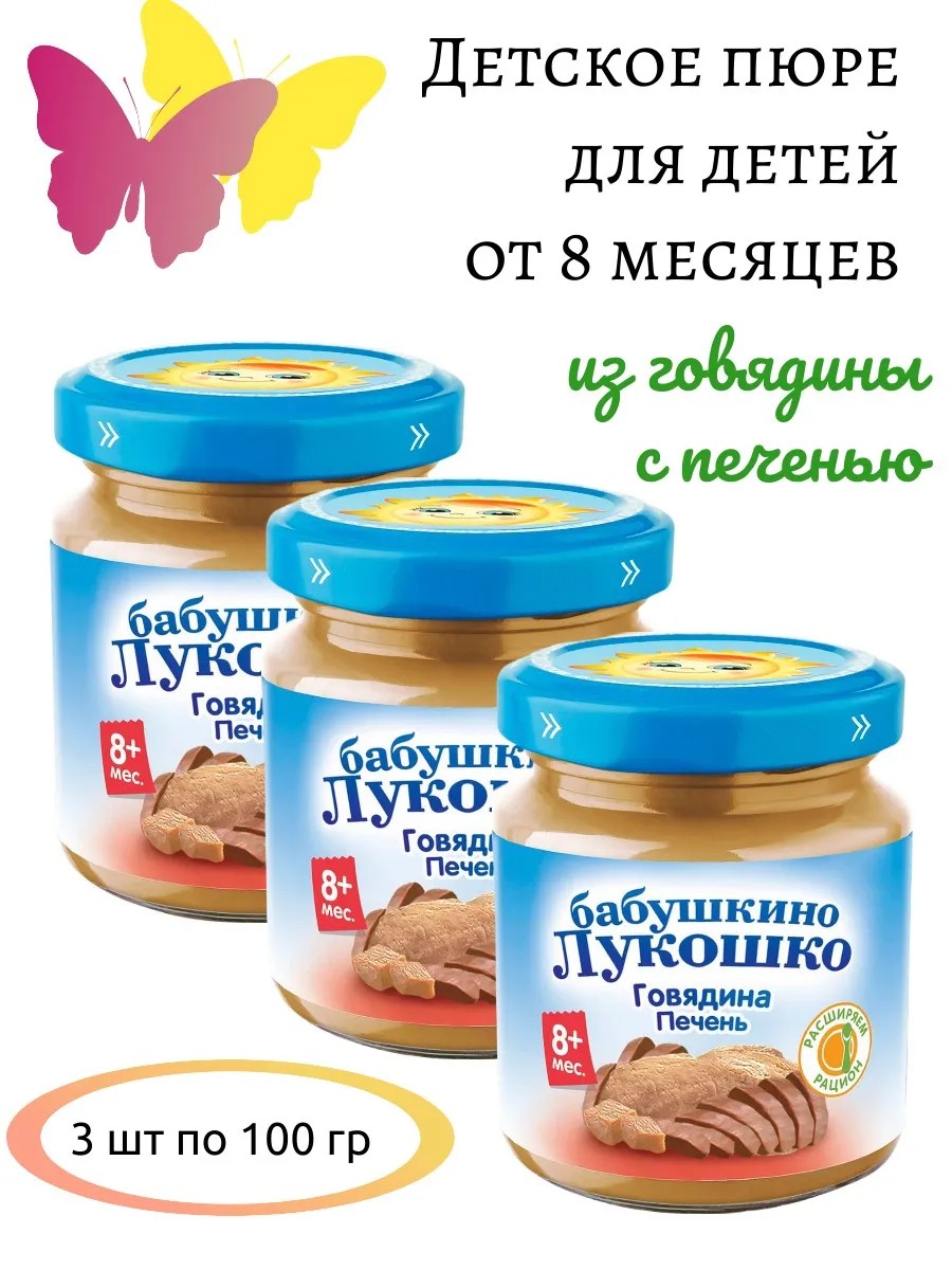 Пюре мясное Бабушкино лукошко Говядина и печень предназначено для питания малышей в возрасте с 8 месяцев. Расширяем рацион. Пюре мясное является источником белка, богато витаминами и минеральными веществами, необходимыми для активного роста и гармоничного развития ребенка. Печень является одним из самых богатых источников железа, которое необходимо для образования гемоглобина. Регулярное употребление говяжьей печени помогает улучшить метаболизм жиров благодаря высокой концентрации витаминов группы В и жирных кислот.