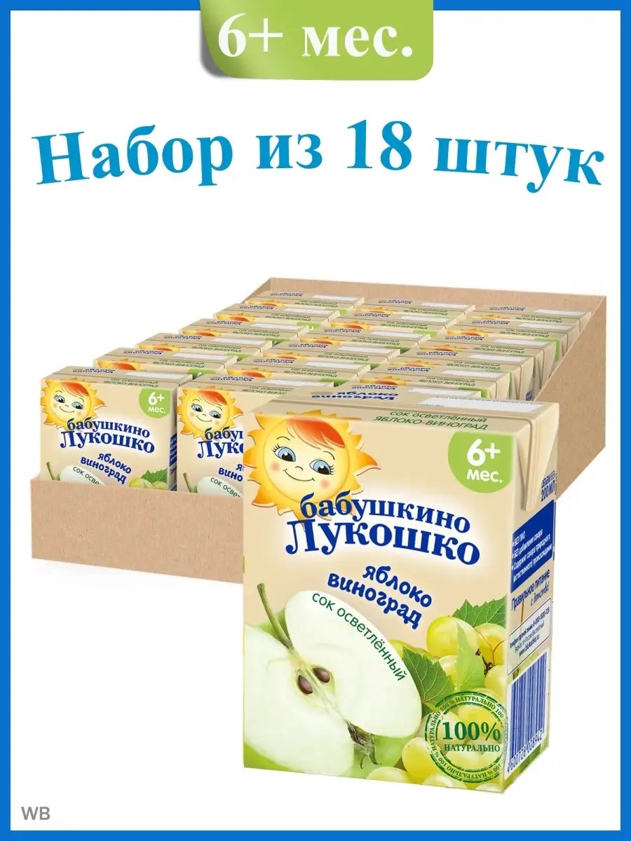 Baby food fruit and berry juice "Babushkino Lukoshko" Apple and Grape for children aged 6 months and older. Apple and grape juice is a source of fruit acids, vitamins (C, B1, B2), minerals (potassium, calcium, phosphorus), and easily digestible natural sugars. Improves metabolism. Has a general tonic effect and a mild laxative effect. The product is ready to use. Shake before use.