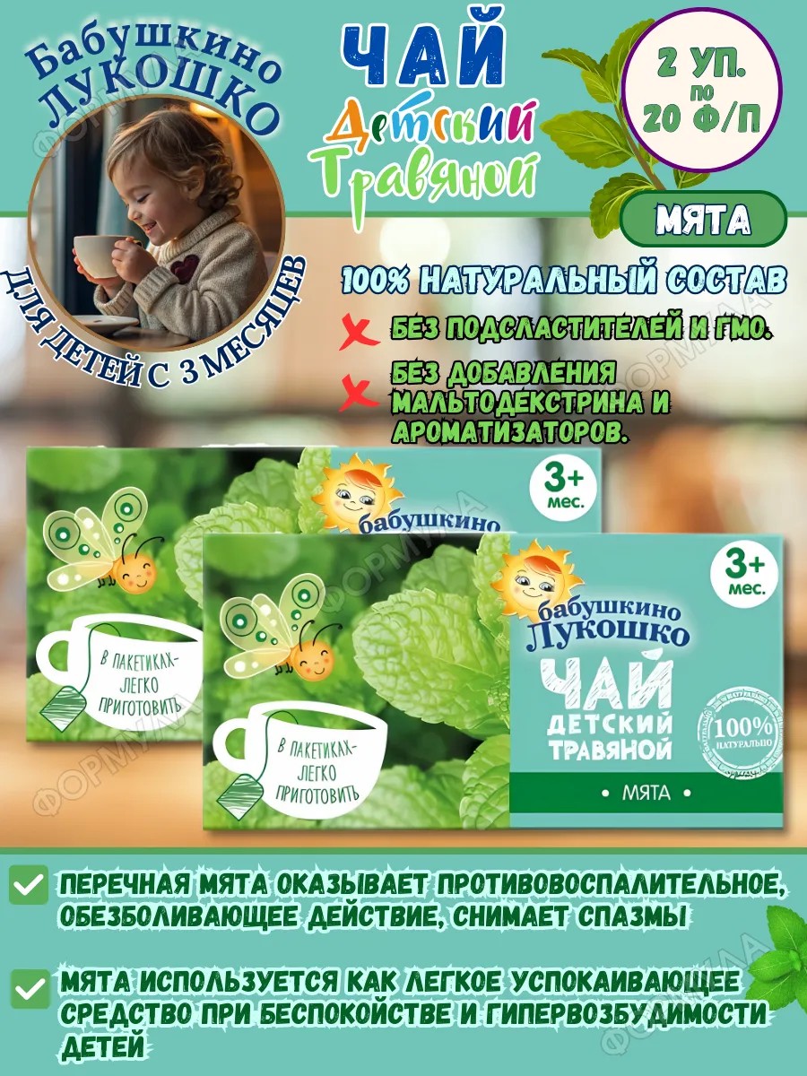 | Package contents | Babushkino Lukoshko children's tea mint n 20 f/p; 2 packs |
