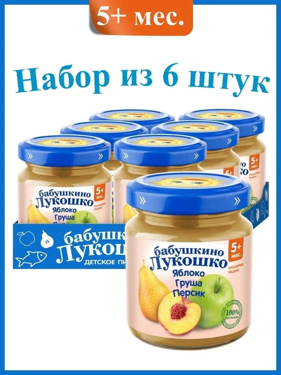 Baby food fruit puree "Babushkino Lukoshko" Apple-Pear-Peach is suitable for children aged 5 months and up. Apple is rich in iron and vitamin C. Pectin and fruit acids gently stimulate the gastrointestinal tract. Pears are beneficial for vision, the nervous system, and the development of the musculoskeletal system. Peaches help boost immunity, strengthen the heart muscle, improve gastrointestinal function, and accelerate metabolism. It is recommended to start with 0.5 teaspoon of the puree, gradually increasing to 100 g per day by 12 months. The product is ready to use. Heat the required amount to 40-50 C and stir. Heat the product in accordance with the operating instructions for household appliances.
