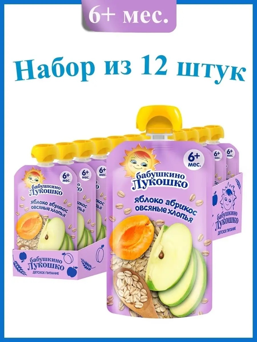 Baby food fruit puree "Babushkino Lukoshko" Apple-Apricot with oatmeal for children aged 6 months and up. Apple is rich in iron and vitamin C, which helps prevent anemia and boosts immunity. Apricot is rich in beta-carotene, vitamins A, B3, B2, B5, B6, B9, C, E, H, and PP, as well as minerals. It helps increase hemoglobin levels and strengthens the body's defenses. Oatmeal helps lower cholesterol and normalizes the nervous system. This tasty and healthy puree in a soft package is easy to take with you on the road, on a walk, or when visiting. It is recommended to start with 0.5 teaspoon twice a day, gradually increasing to 100 g per day. The product is ready to eat.