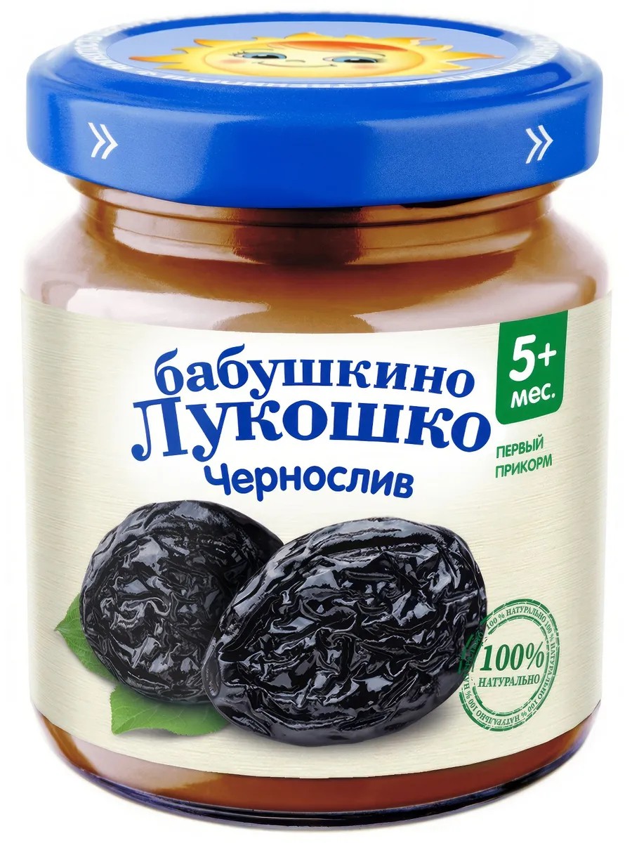 Babushkino Lukoshko Prune Puree, 100g, is a natural product suitable for baby feeding. It is completely safe for baby's health. It improves peristalsis, normalizes metabolism, and helps prevent anemia. The puree comes in an airtight glass jar, making it easy to take on trips, picnics, or walks, so you can feed your baby at any time. After opening, it is recommended to store the product in the refrigerator. The label with the brand logo provides all the necessary information: ingredients, production date, expiration date, calorie content, manufacturer information, and much more.