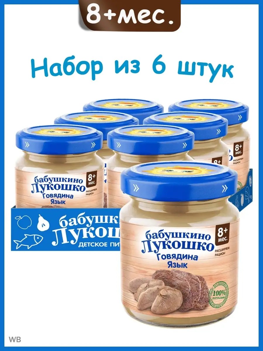 Baby food meat puree "Babushkino Lukoshko" Beef with tongue for children aged 8 months and up. This beef and tongue mixture is a source of vitamin E, provitamin A, B vitamins, and minerals (iron, copper, calcium, zinc, and sodium). Rich in nutrients, tongue is easily digestible and promotes digestion. It is recommended to start with 0.5 teaspoon of the puree, gradually increasing to 100 g per day by 12 months. The product is ready to use. Heat the required amount to 40-50 C and stir. Heat the product in accordance with the operating instructions for household appliances.
