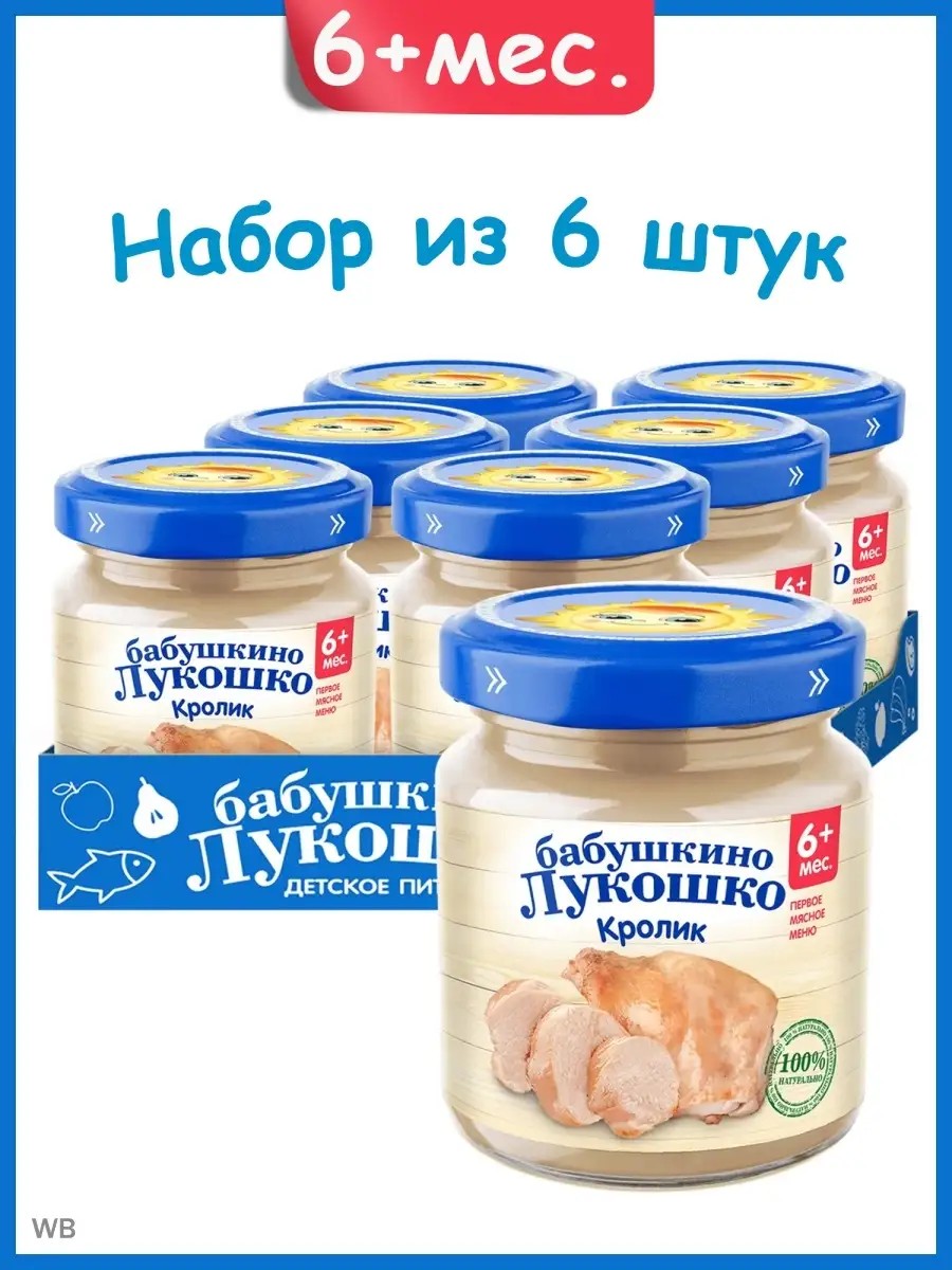 Baby food meat puree "Babushkino Lukoshko Rabbit" for children from 6 months. Rabbit meat is a real "storehouse" of vitamins and minerals. It is rich in B vitamins (B6, B12), contains vitamins C and PP, as well as minerals (iron, potassium, phosphorus, manganese, cobalt and fluorine). It is easily digestible. Due to the low cholesterol and fat content, it is easy to digest. It is recommended to consume the puree starting with 0.5 teaspoon, gradually increasing to 100 g per day by 12 months. The product is ready to eat. Heat the required amount to 40-50 C and stir. Heat the product in accordance with the operating instructions for household appliances.