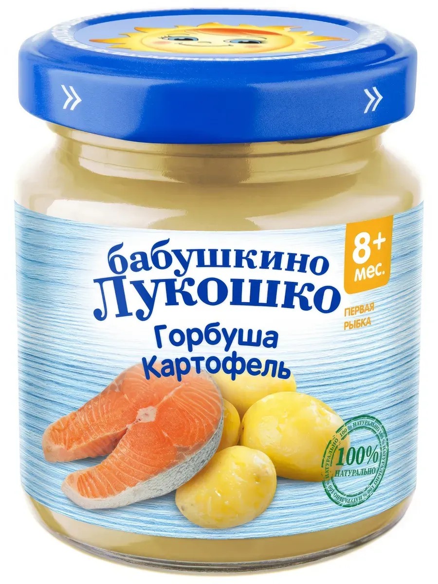 Пюре Бабушкино Лукошко горбуша-картофель, 100 г представляет собой отличный вариант продукта для кормления малышей, начиная с восьми месяцев. В его составе картофель, филе красной рыбы (горбуши), сухое молоко, вода и подсолнечное масло. Для производства не используются ГМО, соль, ароматизаторы и вредные добавки. Введение в рацион ребенка рыбы позволяет наполнить организм жирными кислотами, витаминами, минералами, макро- и микроэлементами. Они необходимы для нормального развития малыша, укрепления костей, насыщения белком. Присутствующий в составе картофель содержит пищевые волокна, которые нужны для правильной работы кишечника. Небольшую стеклянную баночку удобно взять с собой на прогулку или в поездку.