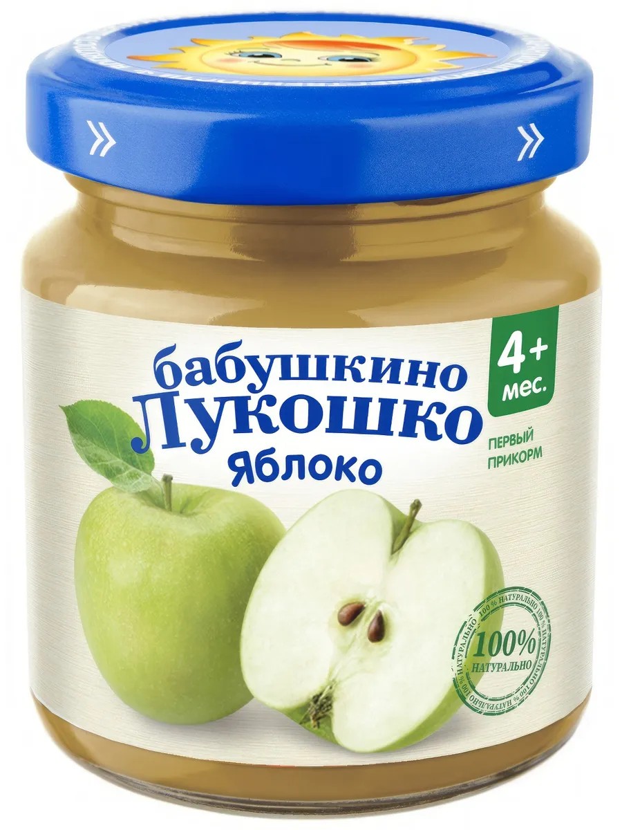 Пюре Бабушкино Лукошко яблоко, 100 г представляет собой натуральный продукт, который подходит для первого прикорма детей, начиная с четырех месяцев. Он приготовлен из яблочного пюре, не содержит в составе вредных добавок, ГМО, сахара, ароматизаторов и консервантов. Продукт полностью безопасен для здоровья ребенка. Яблоко считается источником различных кислот, витаминов, минералов, макро- и микроэлементов. Оно улучшает перистальтику, нормализует обменные процессы, способствует профилактике анемии. Пюре поставляется в герметичной стеклянной баночке, которую удобно взять с собой в поездку, на пикник или прогулку, чтобы в любое время накормить малыша. После ее вскрытия продукт рекомендуется хранить в холодильнике. На этикетке с фирменным логотипом размещена вся необходимая покупателю информация: о составе, дате производства, сроке годности, калорийности, об изготовителе и многое другое.