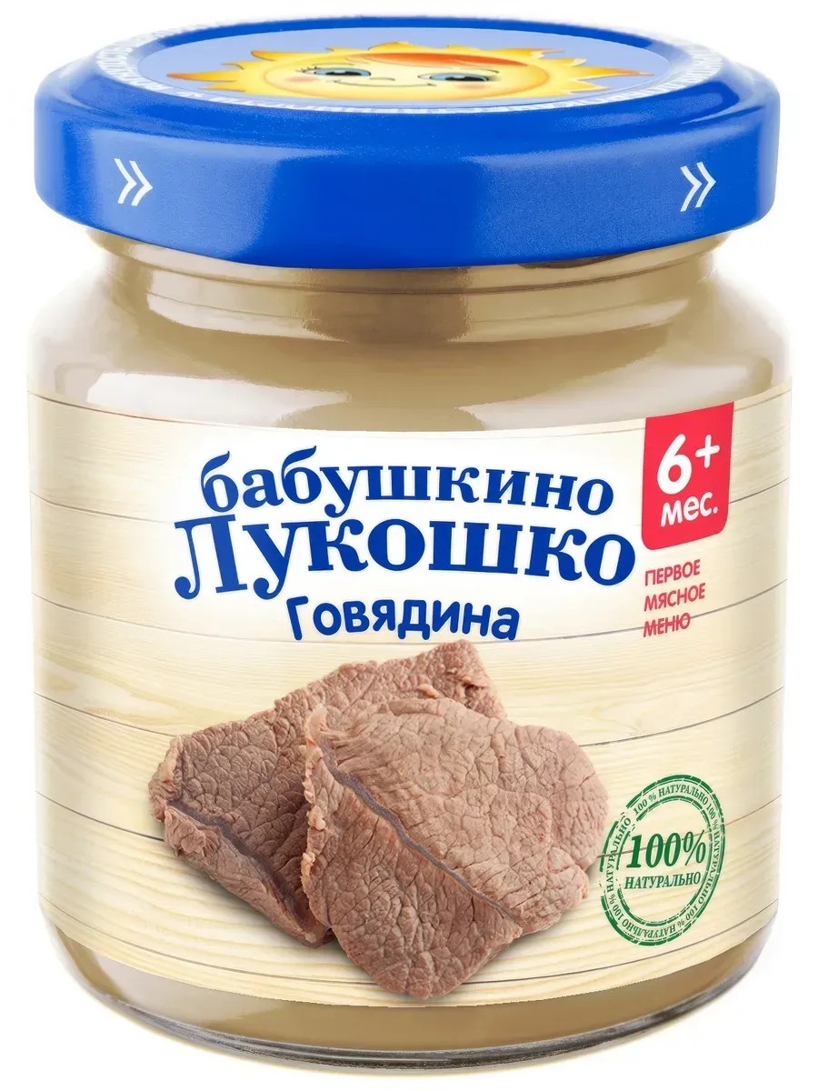 Babushkino Lukoshko Beef Puree, 100g, is an excellent choice for feeding babies. It is made without GMOs, salt, flavorings, or harmful additives. Introducing this product into your baby's diet provides vitamins, minerals, and macro- and microelements. These are essential for normal baby development, strong bones, and protein. The small glass jar is convenient to take with you on walks or trips. The manufacturer's label includes information about the ingredients, production date, expiration date, hotline number, and feeding tips.