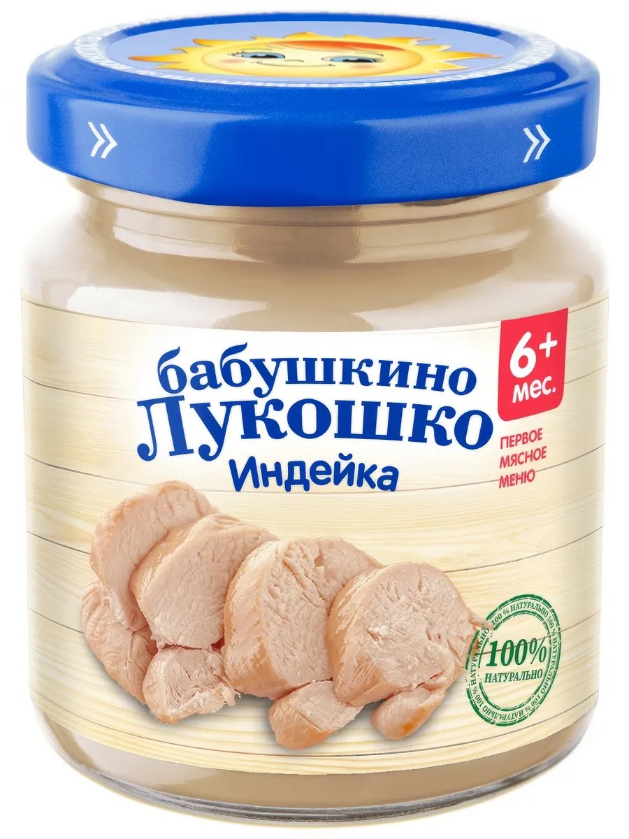 Babushkino Lukoshko Turkey Puree, 100g, is an excellent choice for feeding babies. It is made without GMOs, salt, flavorings, or harmful additives. Introducing this product to your baby's diet helps provide vitamins, minerals, and macro- and micronutrients. These are essential for normal baby development, strong bones, and protein. The small glass jar is convenient to take with you on walks or trips. The manufacturer's label includes information about the ingredients, production date, expiration date, hotline number, and feeding tips.