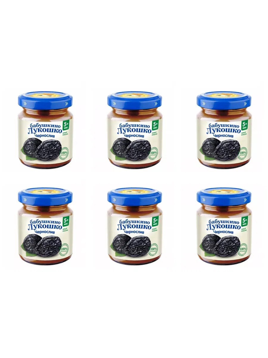 Babushkino Lukoshko Prune Puree for children 5 months and older, 100 g, 6 pieces per package. Prunes are a source of dietary fiber, which regulates bowel function and has a mild laxative effect. They are twice as effective in combating cardiovascular diseases as other natural remedies. Prunes contain sodium, calcium, magnesium, phosphorus, iron, copper, chromium, manganese, zinc, iodine, fluorine, cobalt, and vitamins A, B1, B2, C, and PP.