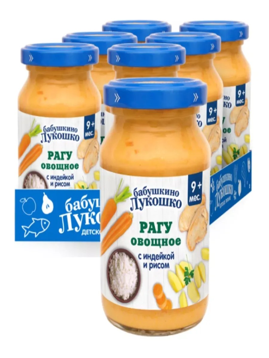 Пюре Рагу овощное с Индейкой и Рисом с 9 месяцев 190 г 6 шт.Вода питьевая, мясо индейки, картофель, пюре из моркови, морковь, рис, масло подсолнечное, лук, соль.
