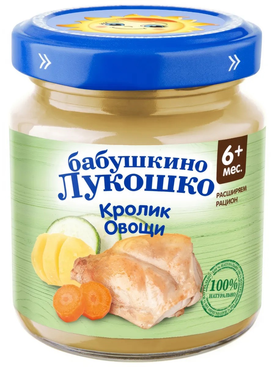 Babushkino Lukoshko Rabbit and Vegetable Stew, 100g, is a baby food product. Its perfectly balanced puree formula fully meets the growing baby's energy and essential nutrients needs. It stimulates digestion and improves appetite, and has a positive effect on metabolism. It does not contain GMOs or starch. The stew is ready to eat.