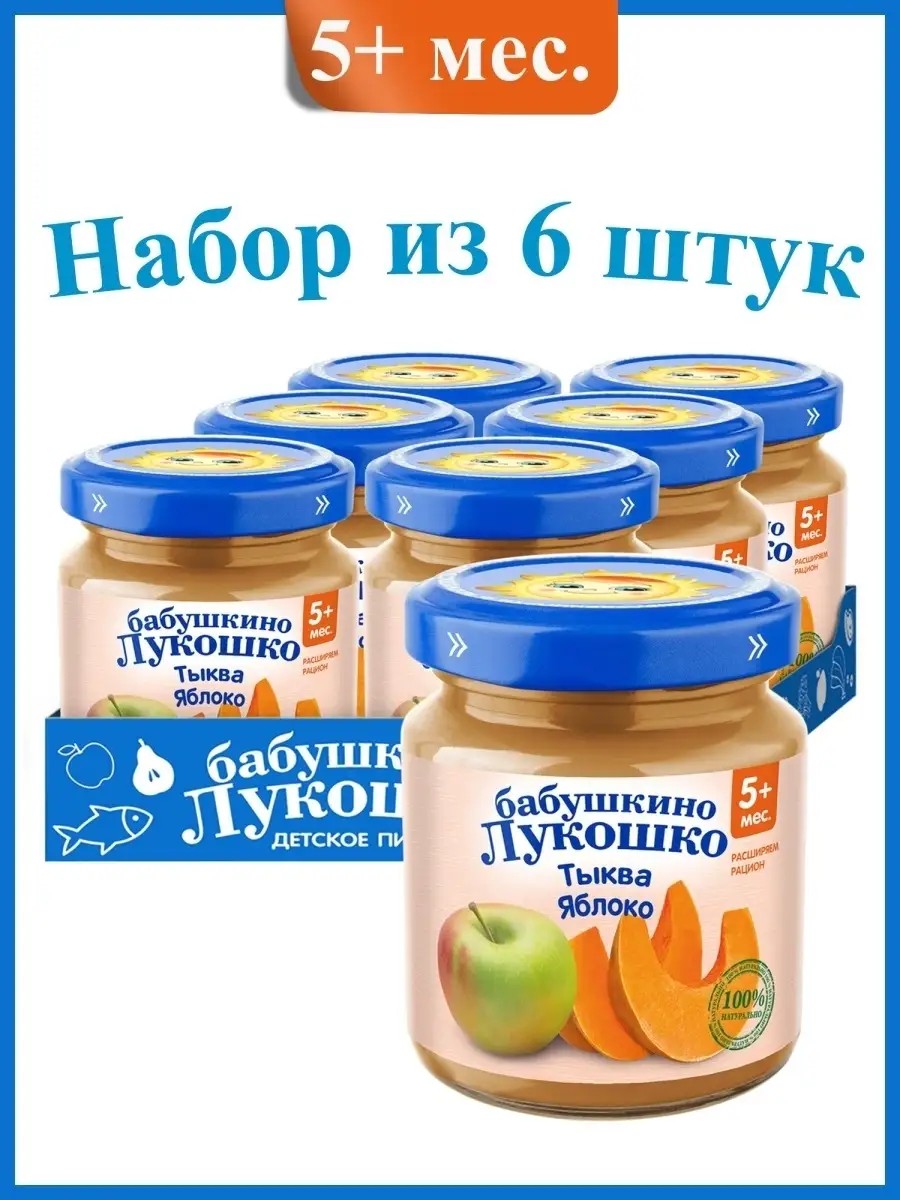 Детское питание овощное-фруктовое пюре Бабушкино лукошко Тыква-яблоко для питания детей с 5 месяцев. Пюре Тыква с яблоком содержит большое количество каротина, витаминов С, Е и D которые помогают малышу расти здоровым. В тыкве содержится большое количество клетчатки, которая способствует нормализации пищеварения. Отсутствие соли и сахара в пюре соответствует последним рекомендациям детских диетологов и позволяет сформировать привычки здорового питания с самого раннего возраста. Пюре рекомендуется употреблять начиная с 0,5 чайной ложки, постепенно увеличивая к 12 месяцам до 100 г в день. Продукт готов к употреблению. Необходимое количество подогреть до 40-50 С и перемешать. Разогревать продукт в соответствии с правилами эксплуатации бытовых приборов.