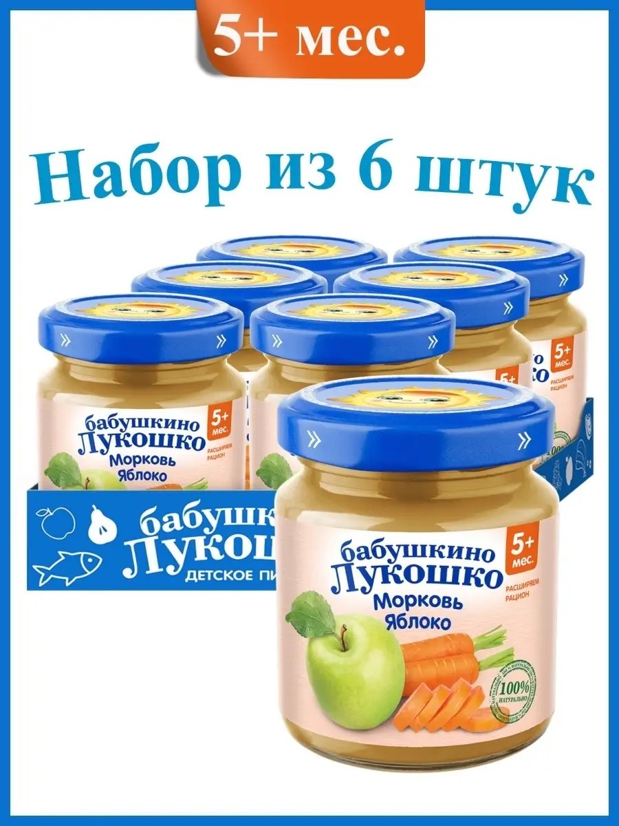 Baby food fruit and vegetable puree "Babushkino Lukoshko" Carrot and Apple is for children aged 5 months and up. Carrot and Apple puree is rich in beta-carotene, which the body converts into vitamin A, essential for the normal functioning of the immune system, healthy skin, and good vision. The dietary fiber contained in carrots promotes normal digestion. The absence of salt and sugar in this puree complies with the latest recommendations from pediatric nutritionists and helps develop healthy eating habits from a very early age. It is recommended to start with 0.5 teaspoon of the puree, gradually increasing to 100 g per day by 12 months. The product is ready to use. Heat the required amount to 40-50 C and stir. Heat the product in accordance with the operating instructions for household appliances.