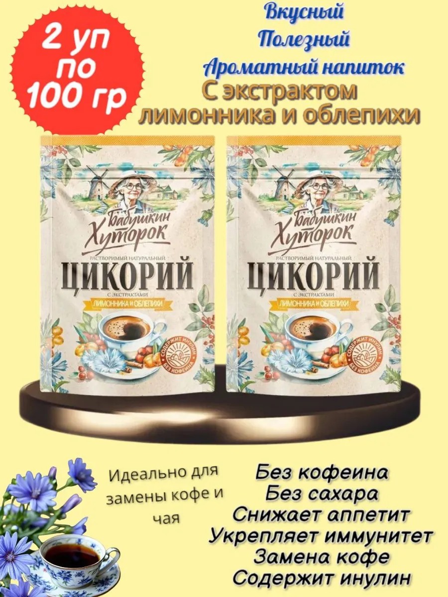 | Комплектация | цикорий растворимый; порошкообразный цикорий; натуральный цикорий; кофе растворимый; заменитель кофе; заменитель кофеина; витаминный напиток; БАБУШКИН ХУТОРОК цикорий порошок; БАБУШКИН ХУТОРОК цикорий порошок ЛИМОННИК/ОБЛЕПИХА |