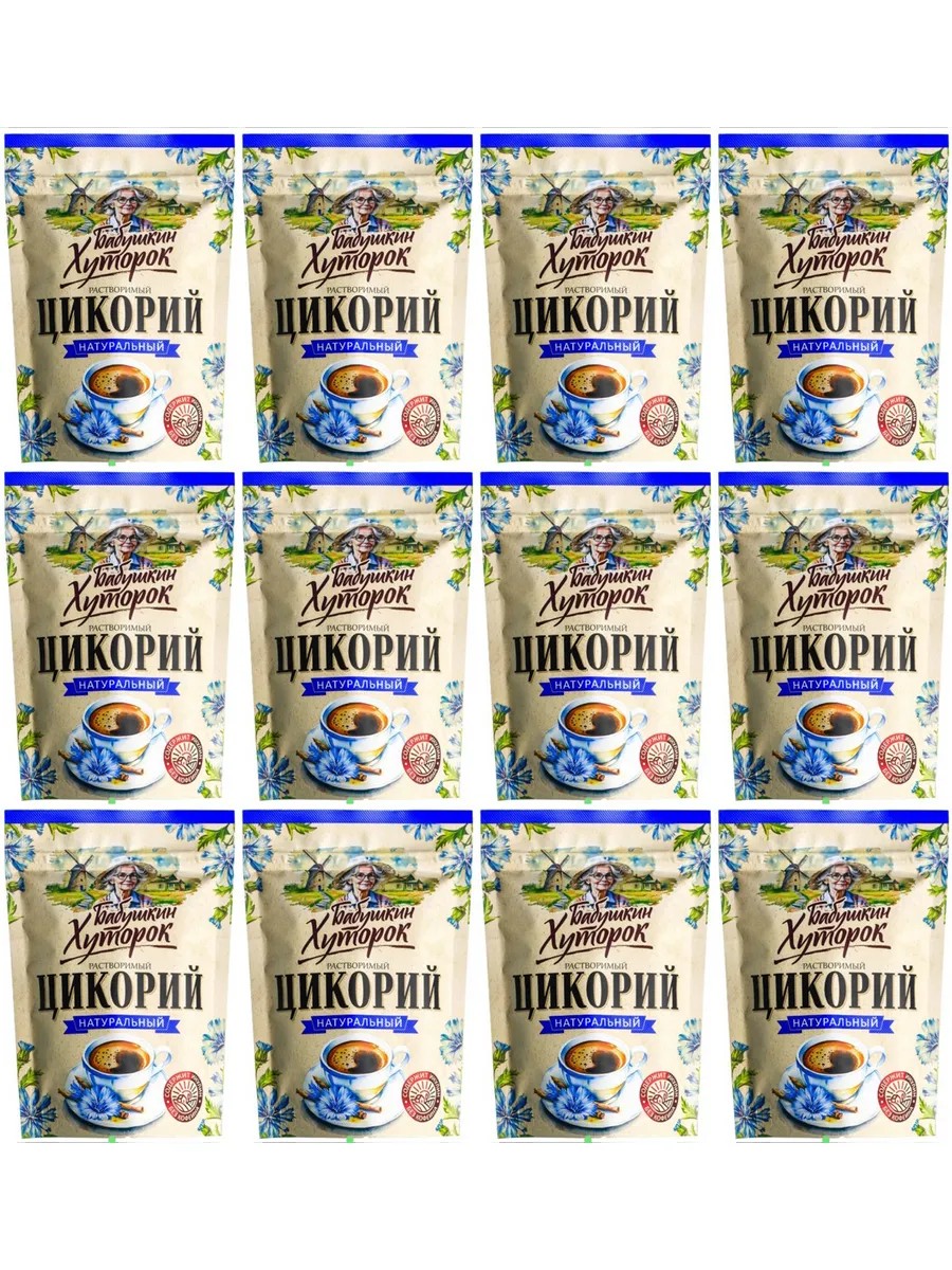 Babushkin Khutorok Classic Chicory Powder, 12 packs of 100 g. Chicory is rich in vitamins and microelements essential for the normal functioning of the human body. Inulin, found in chicory, improves metabolism, normalizes digestion, and significantly reduces toxins and waste. Regular consumption of chicory plays a positive role in the fight against excess weight. The rich taste and aroma of this drink will bring you true pleasure. Preparation: pour 1-2 teaspoons (2-4 g) of the drink into a 150 ml cup, pour 150 ml of hot water, and stir. Ingredients: chicory extract.